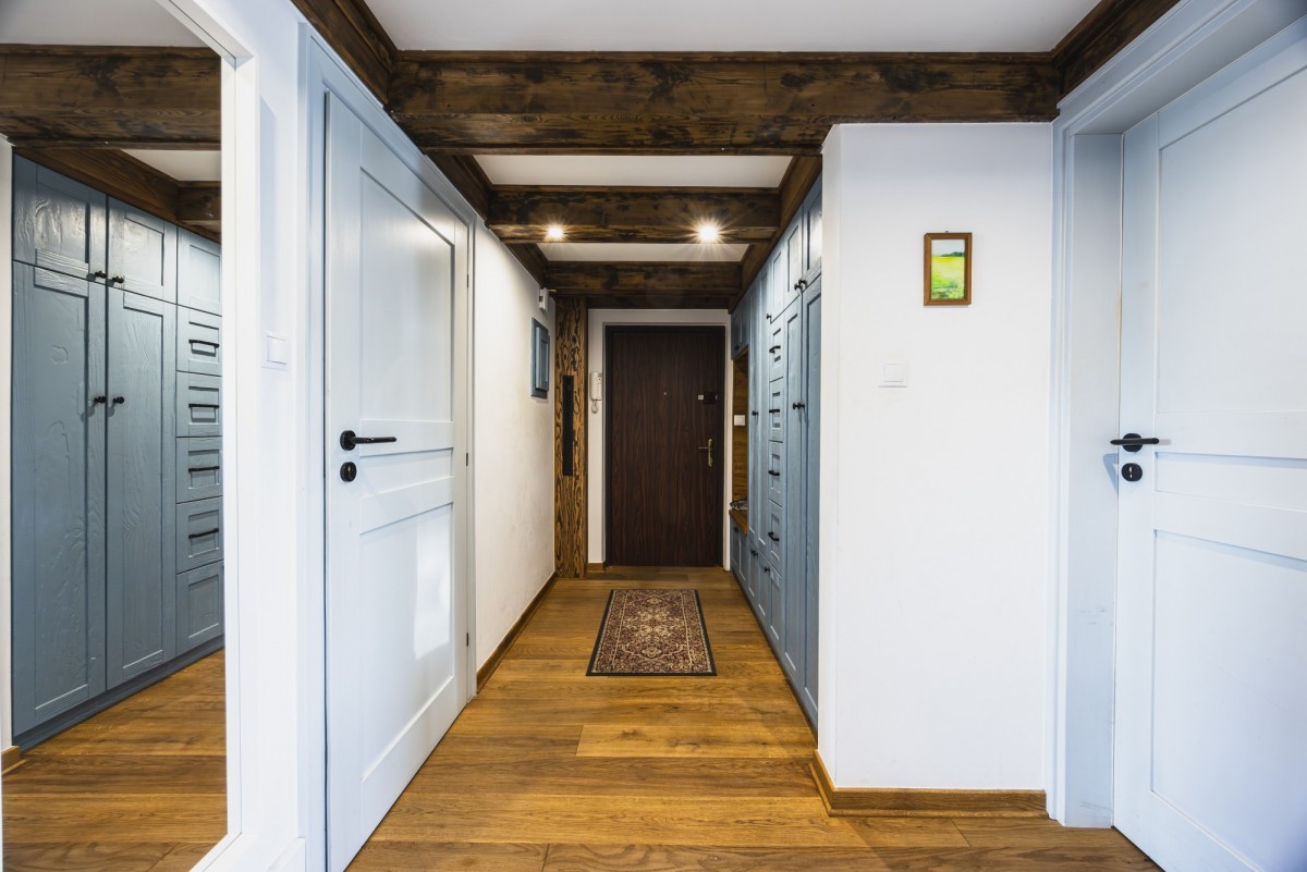 Przedpokój - 9 mkw - duża przestrzeń z obszernym miejscem do przechowywania ubrań, wygodne siedzisko z miejscem do wieszania okryć wierzchnich.