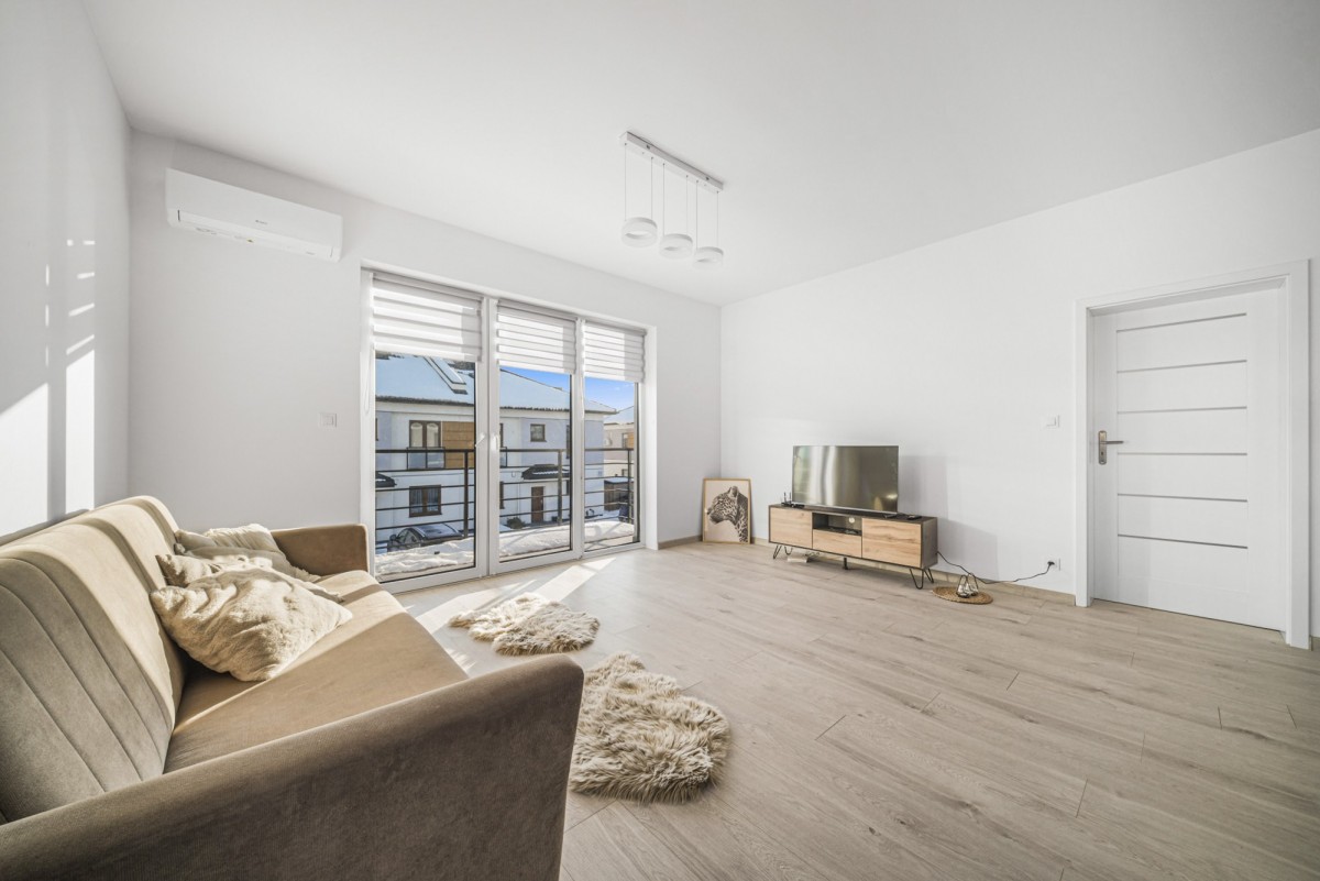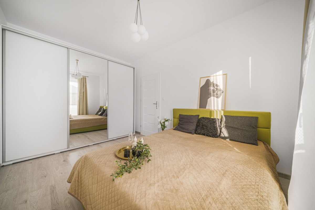Pierwsze piętro to gotowa do zamieszkania przestrzeń, salon z w pełni wyposażonym aneksem kuchennym, dwie przytulne sypialnie z pojemnymi szafami i dużą łazienka. Nie zapominajmy o tarasie!
