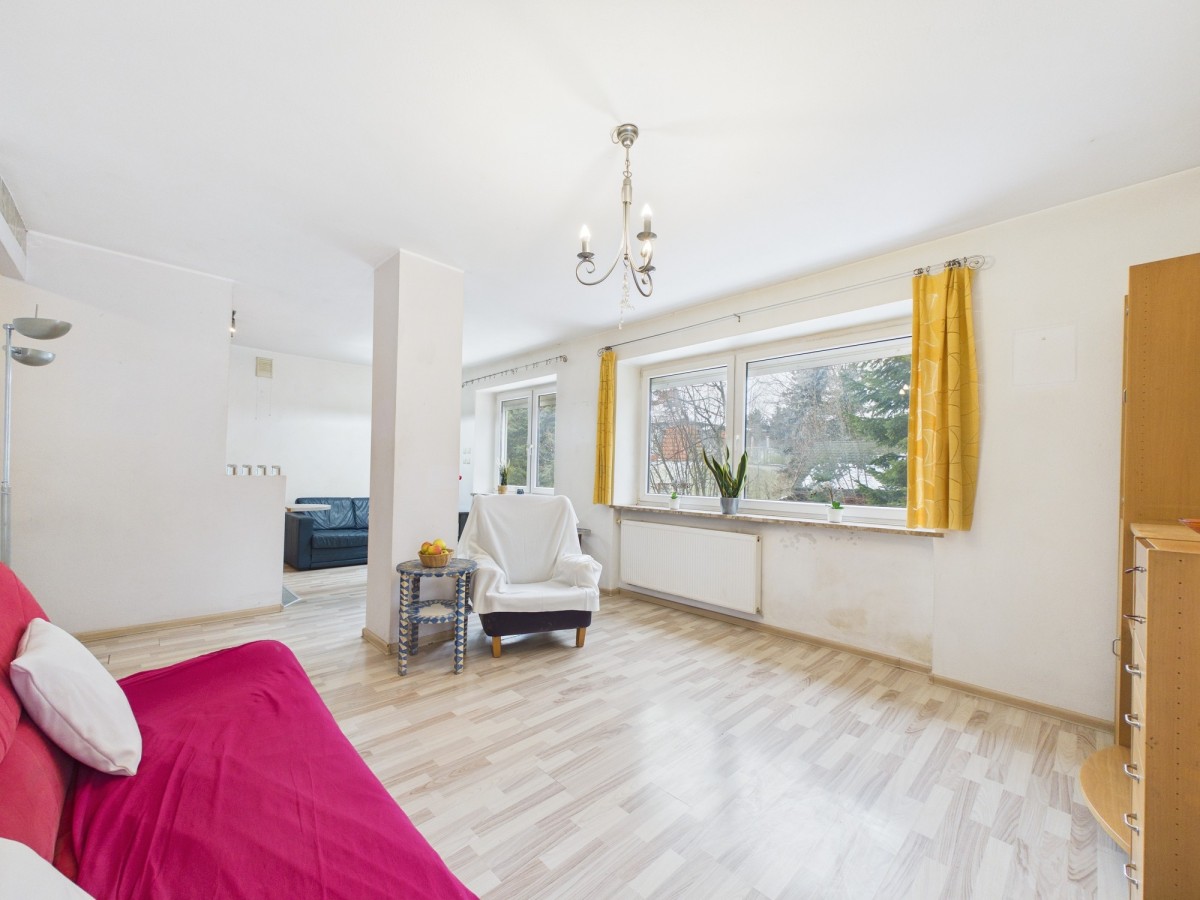 • Salon z aneksem kuchennym - przestronny, doskonale doświetlony dzięki dużym oknom, idealny do relaksu, spotkań z rodziną i przyjaciół.