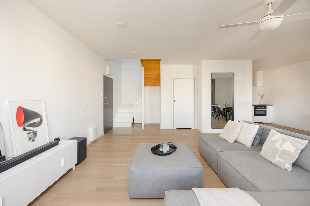 Piękne, symetryczne białe schody stanowią centralny punkt wnętrza i prowadzą na górny poziom. Otwartość przestrzeni między piętrami dodaje mieszkaniu wysokości i lekkości.
