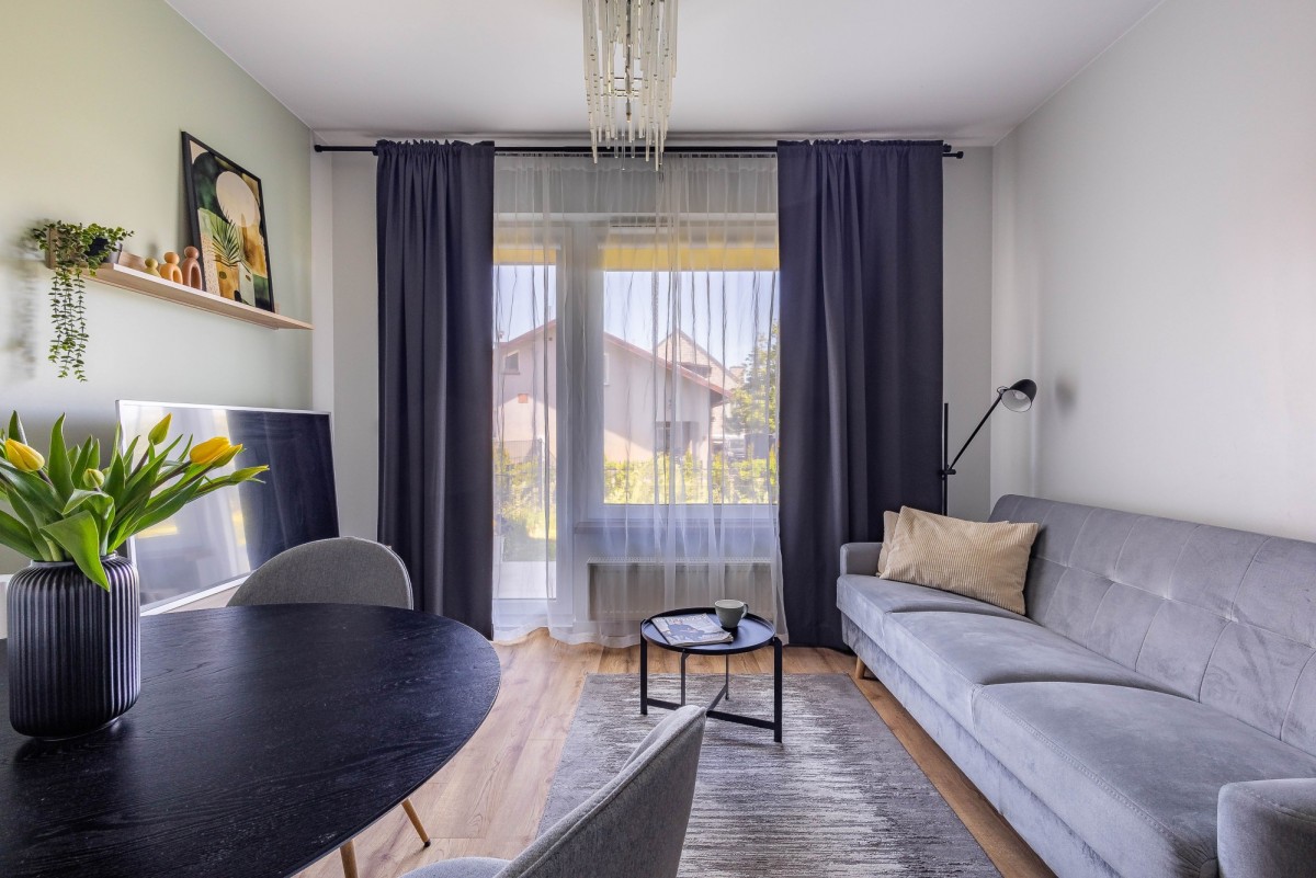 - stosunkowo duży salon, połączony z doskonale wkomponowanym w pełni wyposażonym, ergonomicznym aneksem kuchennym, w części tej znajduje się również wyjście na taras 10 m2 i niewielki ogródek około 50 m2