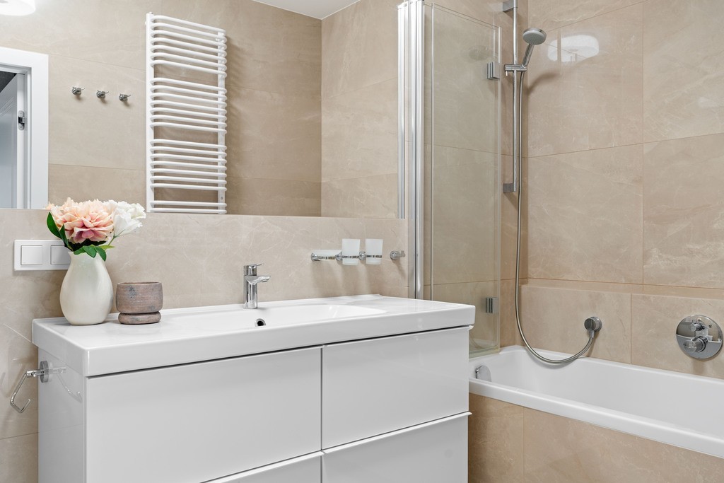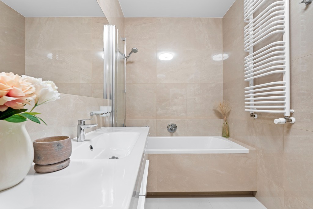 Łazienka z wanną oraz pralnią, elegancko wykończona, z wygodnym miejscem na pralkę, suszarkę i praktycznymi szafkami.