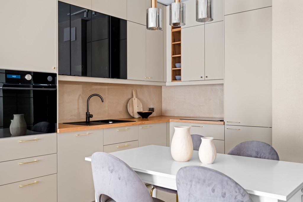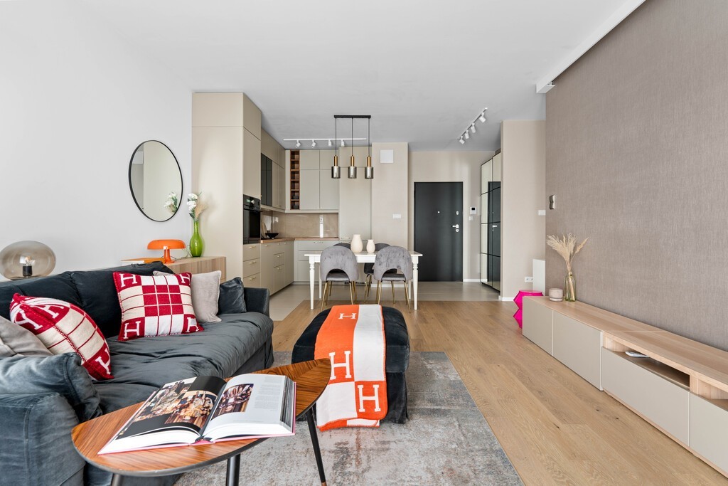 Salon z aneksem kuchennym i wyjściem na balkon- serce mieszkania, utrzymane w nowoczesnym, a zarazem przytulnym stylu. Aneks kuchenny wyposażony jest w sprzęty renomowanych marek (lodówka Samsung, piekarnik z funkcją pary, duża zmywarka 60 cm) oraz zabudowę wykonaną na wymiar, która harmonijnie wpisuje się w wystrój wnętrza.