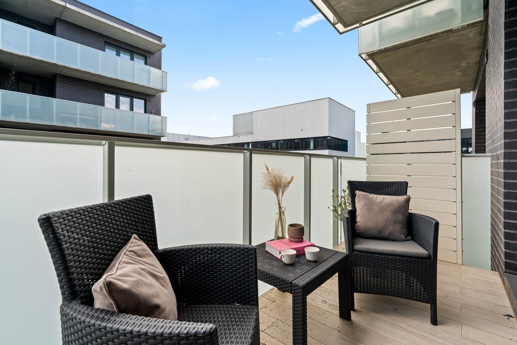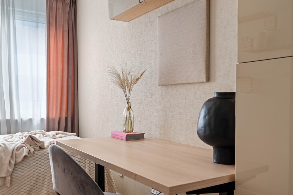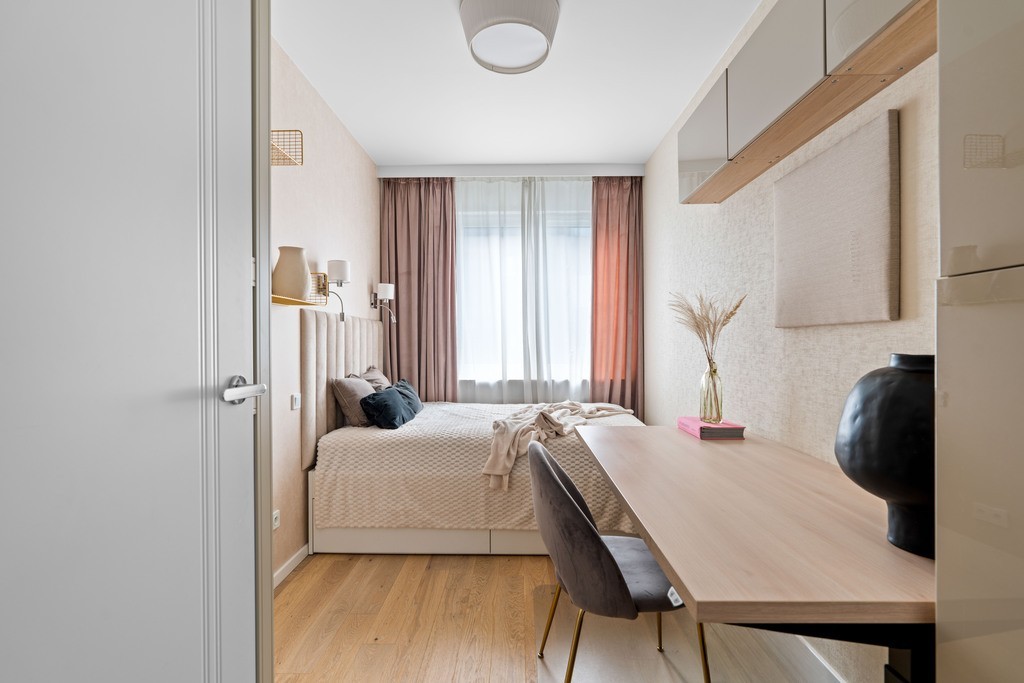Wnętrze łączy funkcjonalność z elegancją: na podłodze znajduje się wysokiej klasy deska Barlinecka, a w wybranych strefach zastosowano kamienie włoskie, które nadają przestrzeni luksusowego charakteru. Mieszkanie jest jasne, dzięki południowej ekspozycji, a duże okna zapewniają naturalne doświetlenie przez cały dzień.