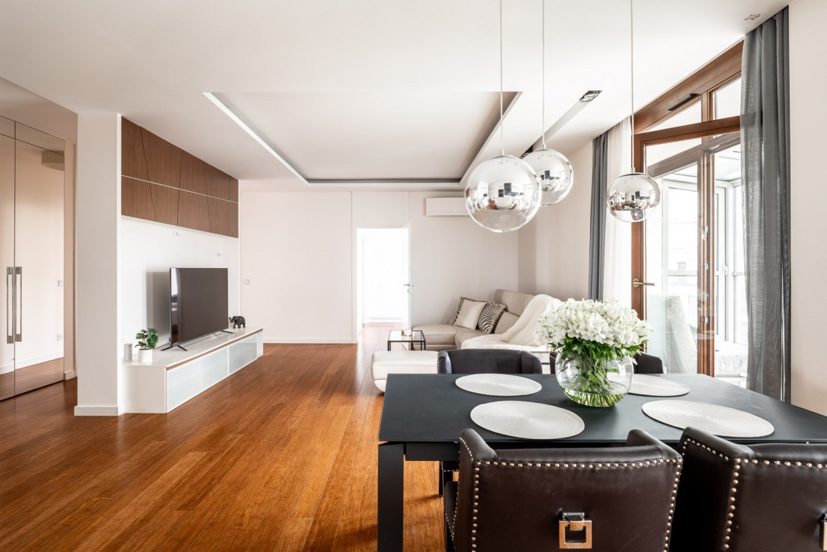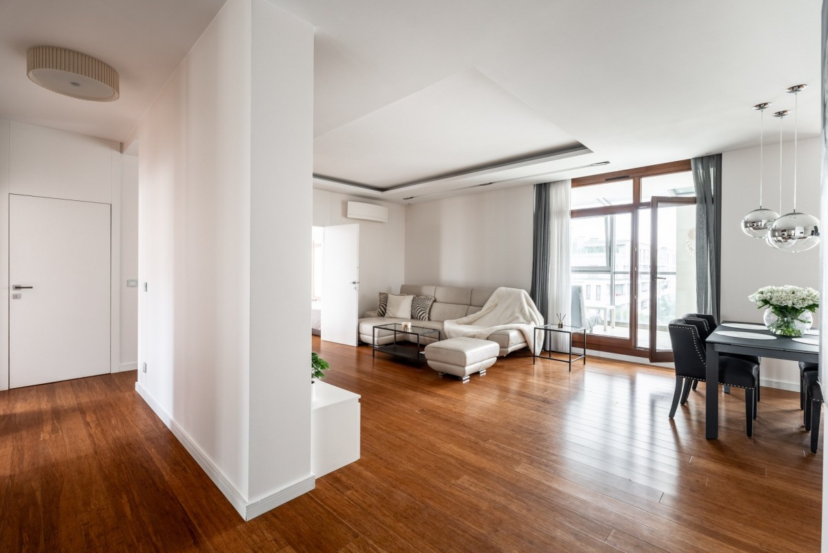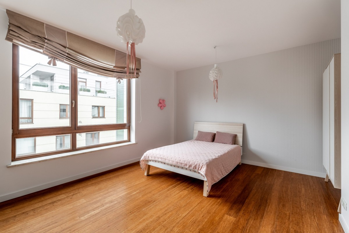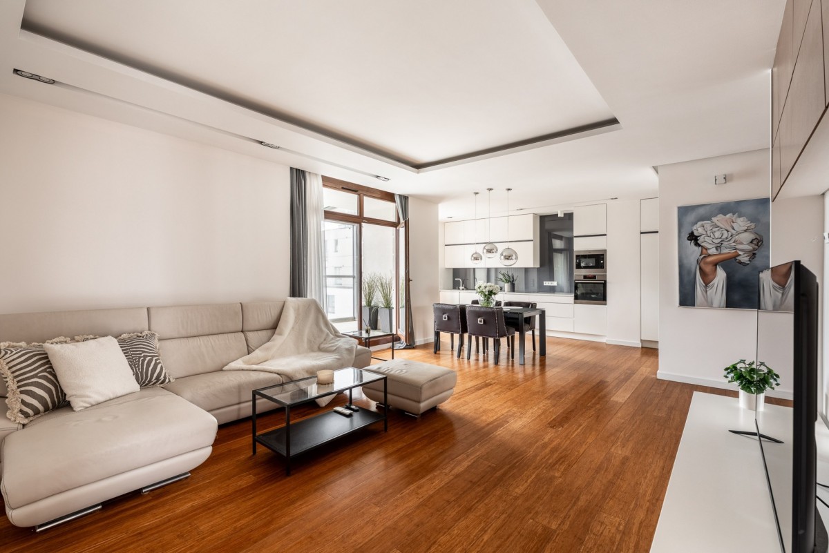 Apartament wykończony w wysokim standardzie, z dbałością o każdy detal. Zastosowano materiały najwyższej jakości — na podłogach znajduje się naturalne drewno, a w łazienkach elegancka ceramika i armatura renomowanych producentów.