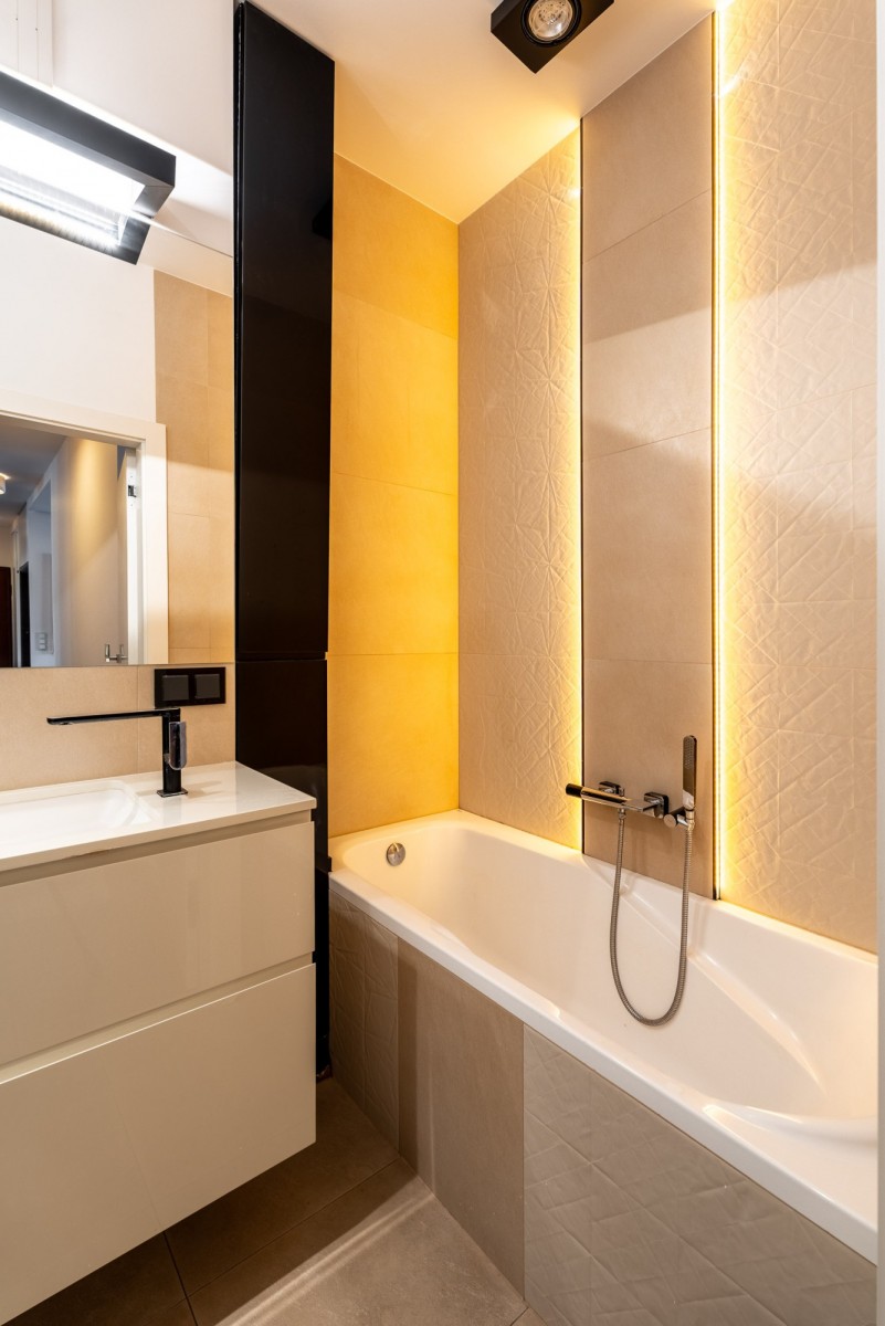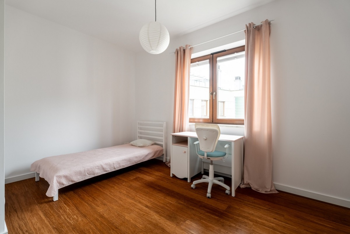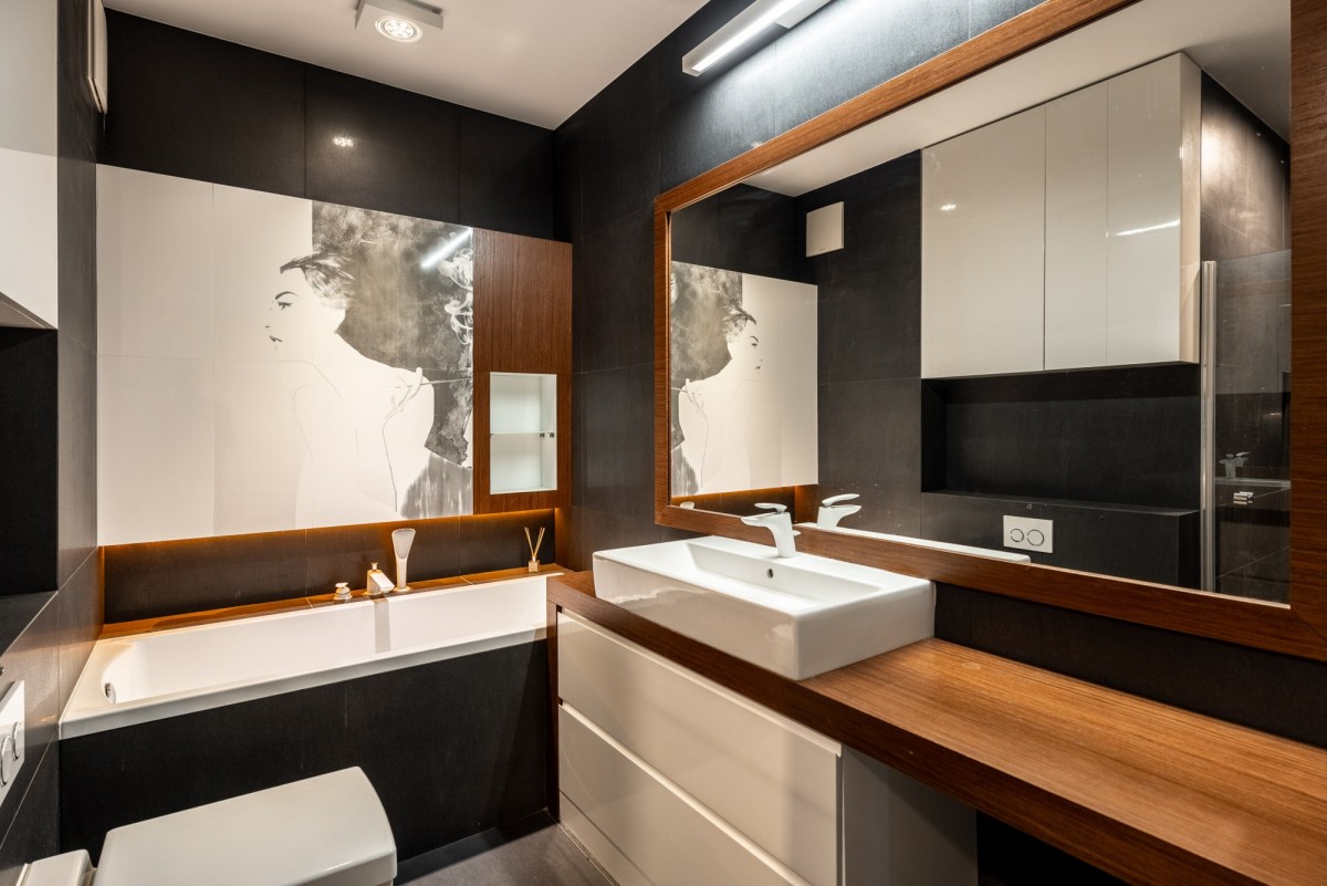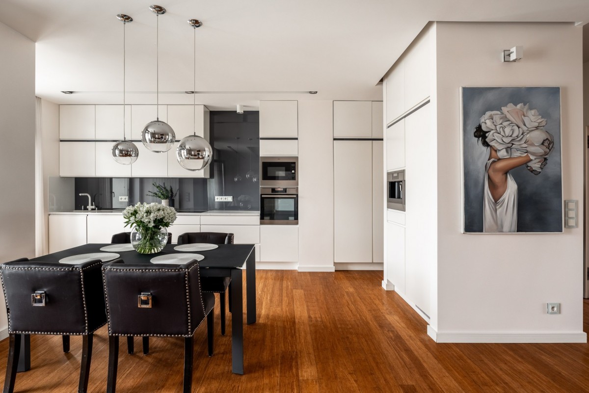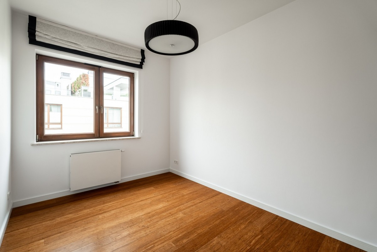 Apartament wykończony w wysokim standardzie, z dbałością o każdy detal. Zastosowano materiały najwyższej jakości — na podłogach znajduje się naturalne drewno, a w łazienkach elegancka ceramika i armatura renomowanych producentów.