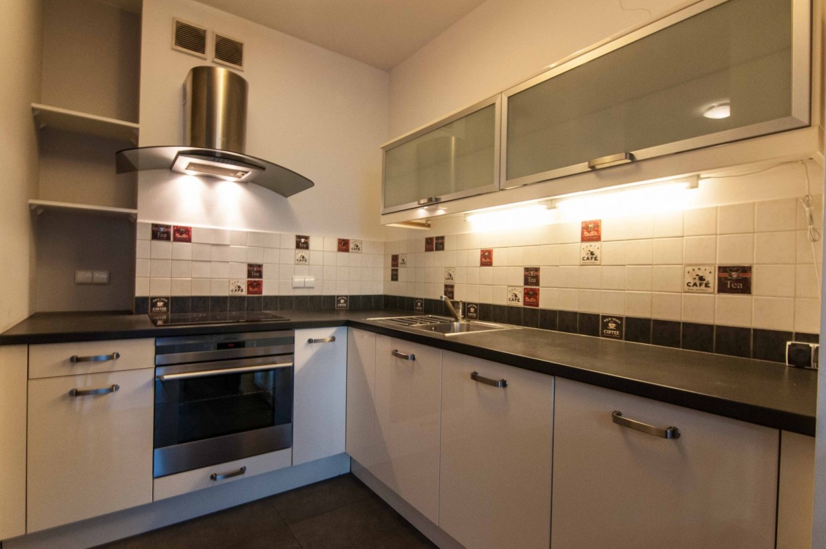 Kuchnia 6,5 m2, wyposażona: płytę ceramiczną, piekarnik i dużą lodówkę.