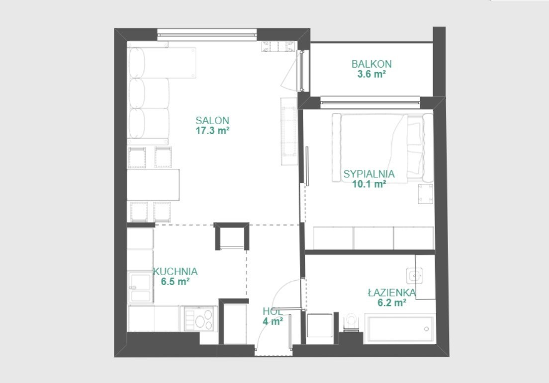 Duży pokój 17,3 m2 otwarty na kuchnię z wyjściem na loggię ok. 3,5 m2