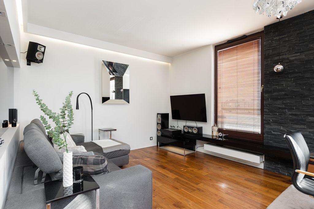 Luksusowy apartament z dużym tarasem położony na ostatnim, czwartym piętrze budynku z 2009 roku przy Alei Rzeczypospolitej 18, w inwestycji Scandinavian House na terenie Miasteczka Wilanów.