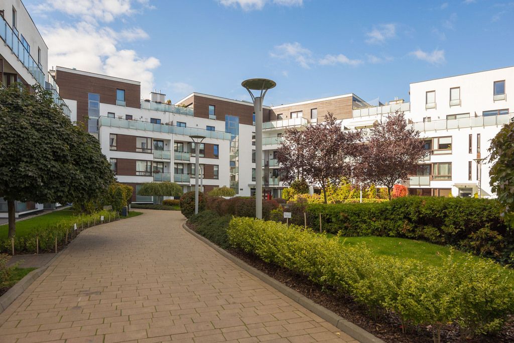 Apartament położony jest w centralnej części Miasteczka Wilanów. Okolica wyróżnia się nowoczesną architekturą, licznymi terenami zielonymi i pełną infrastrukturą miejską.
