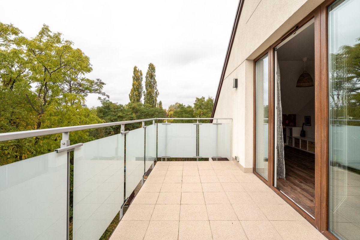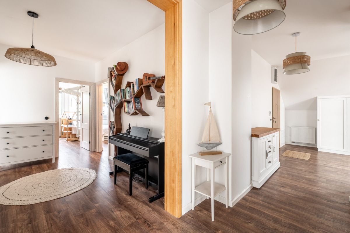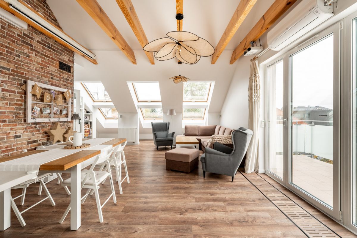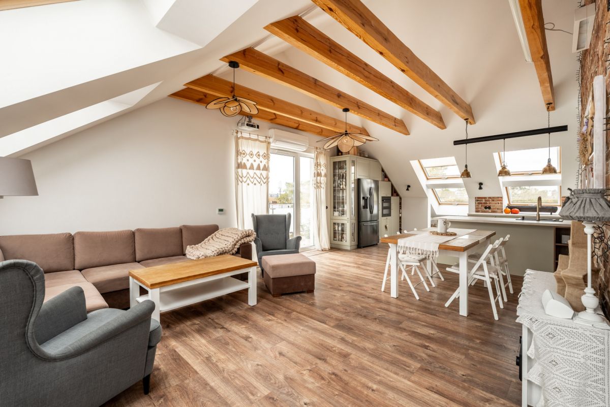 Wnętrza wykończone są w wysokim standardzie, z dbałością o każdy detal. W mieszkaniu znajduje się również bardzo przestronny salon, doskonale doświetlony światłem słonecznym dzięki 10 oknom dachowym, z podniesionym sufitem sięgającym 5 m w najwyższym punkcie, co nadaje wnętrzu wyjątkowej lekkości i przestrzeni.