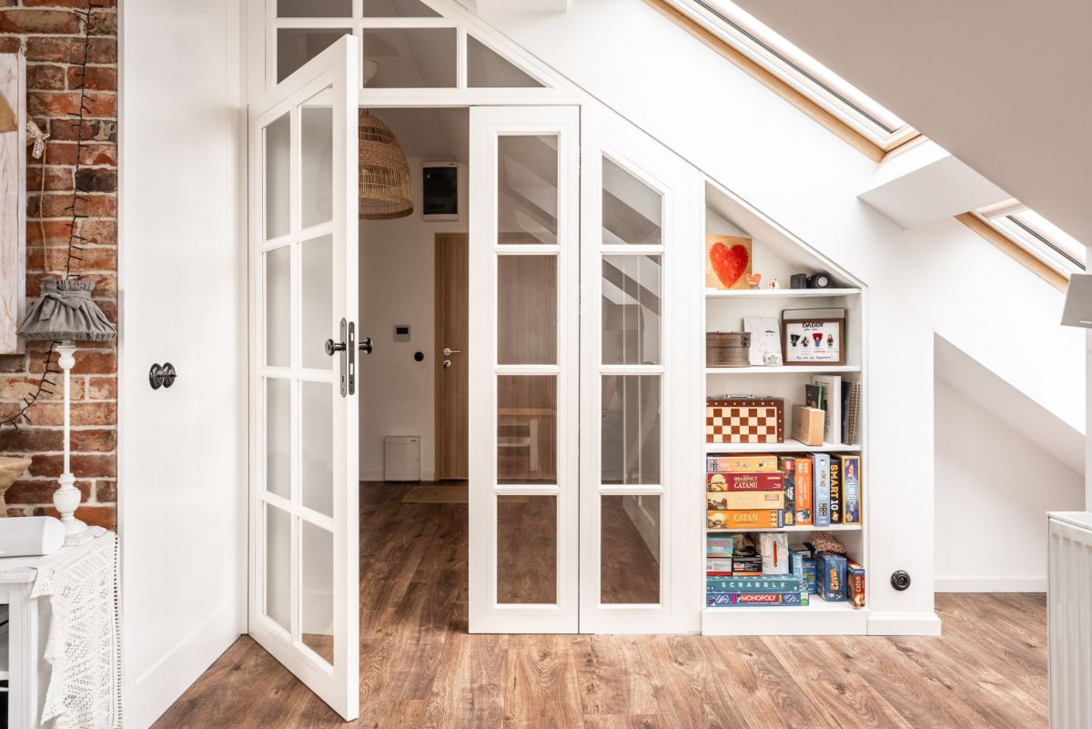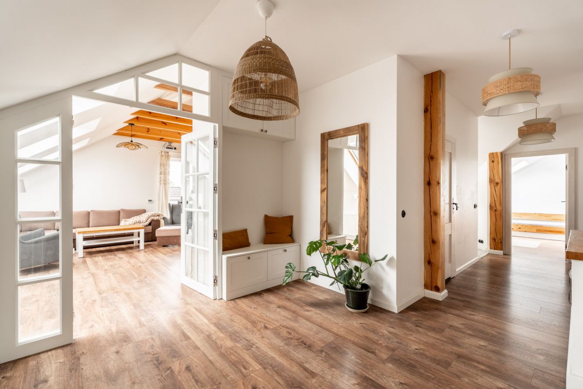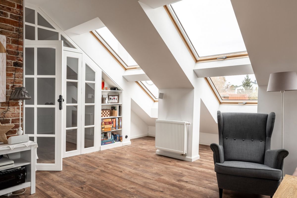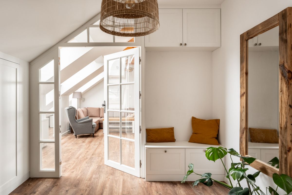 Wnętrza wykończone są w wysokim standardzie, z dbałością o każdy detal. W mieszkaniu znajduje się również bardzo przestronny salon, doskonale doświetlony światłem słonecznym dzięki 10 oknom dachowym, z podniesionym sufitem sięgającym 5 m w najwyższym punkcie, co nadaje wnętrzu wyjątkowej lekkości i przestrzeni.