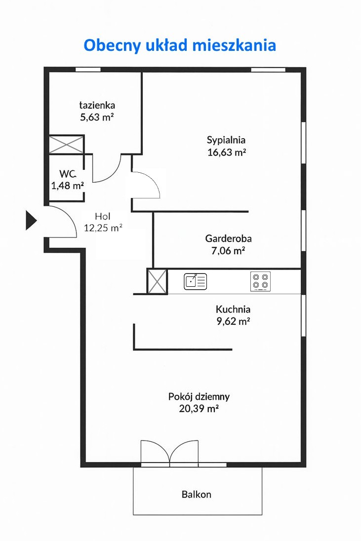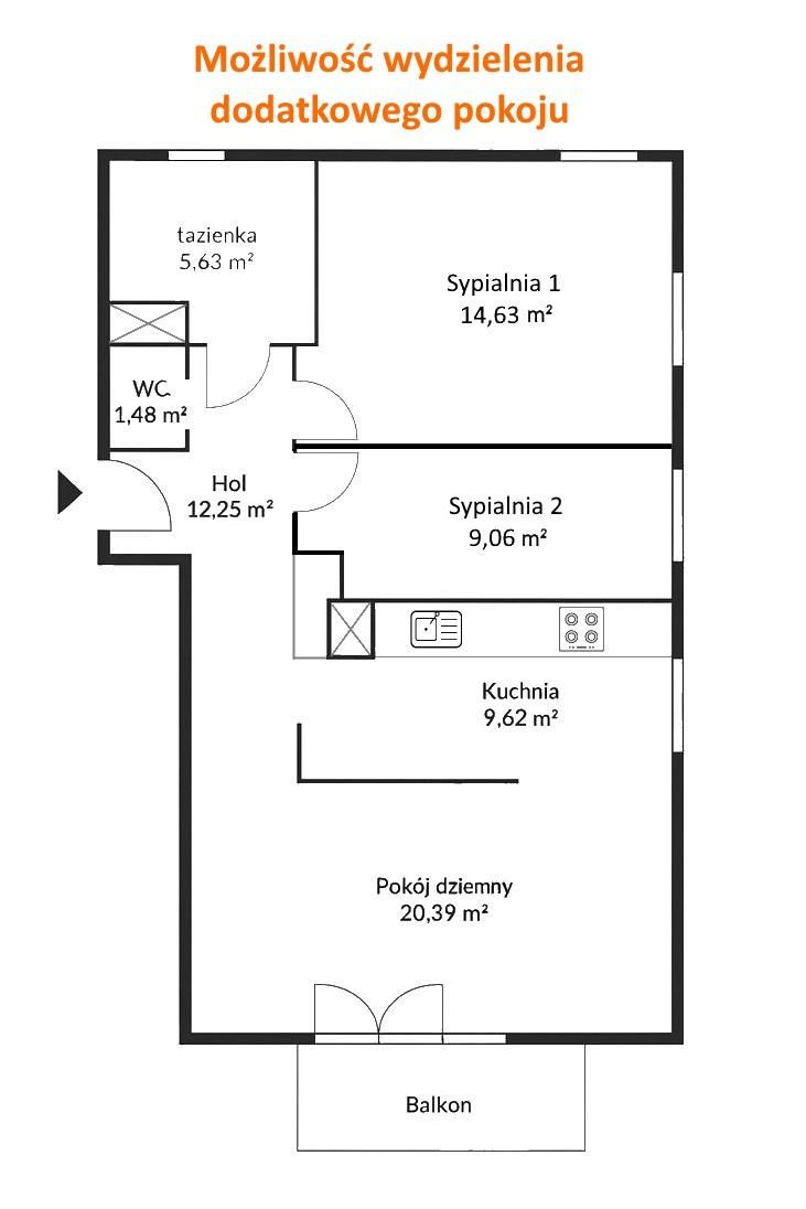 Mieszkanie można w prosty sposób przeplanować na 3-pokojowe, wydzielając dodatkową sypialnię gabinet lub pokój dziecięcy, zachowując funkcjonalność i wygodę przestrzeni.
