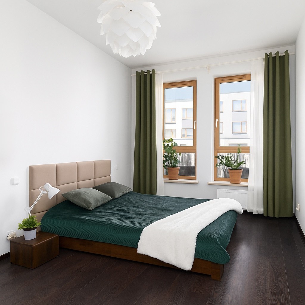 * Ergonomiczna sypialnia, jasna i funkcjonalna, z dużą szafą i wydzielonym miejscem do pracy.