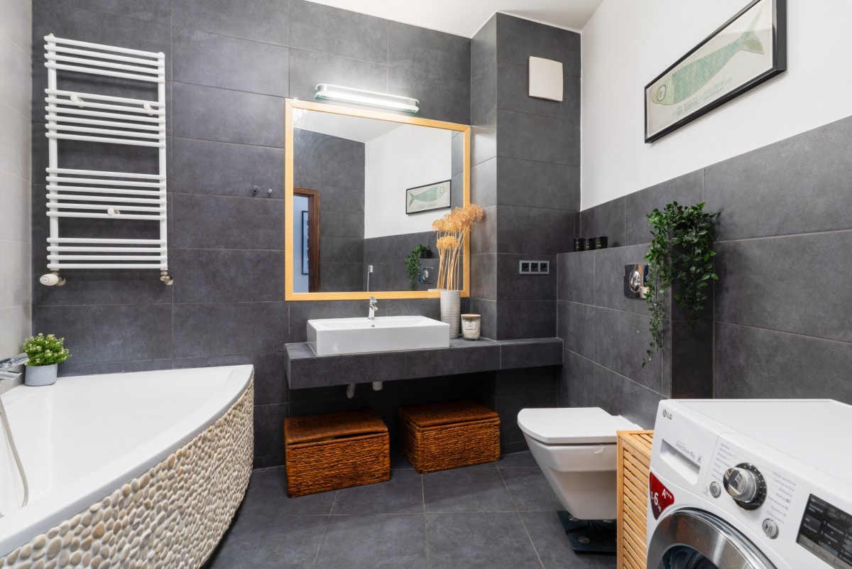 * Komfortowa łazienka, wyposażona w dużą wannę, zaprojektowana z myślą o relaksie i wygodzie.