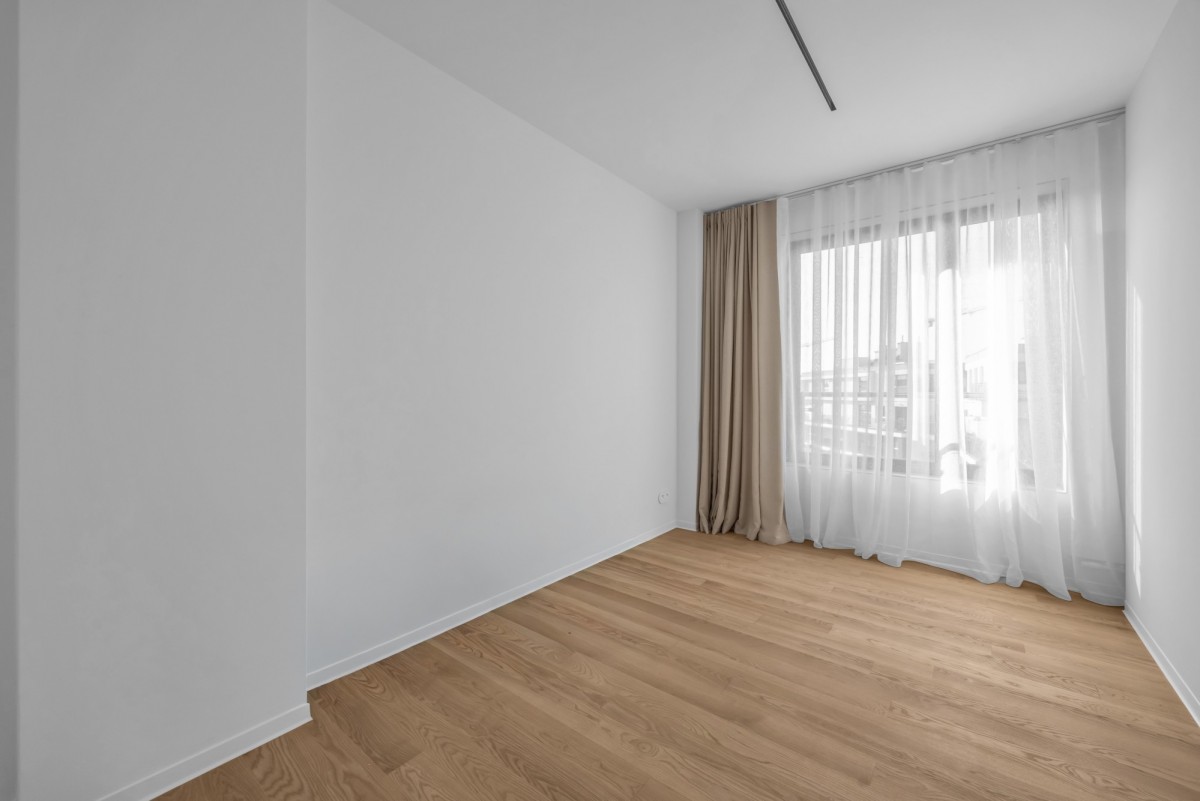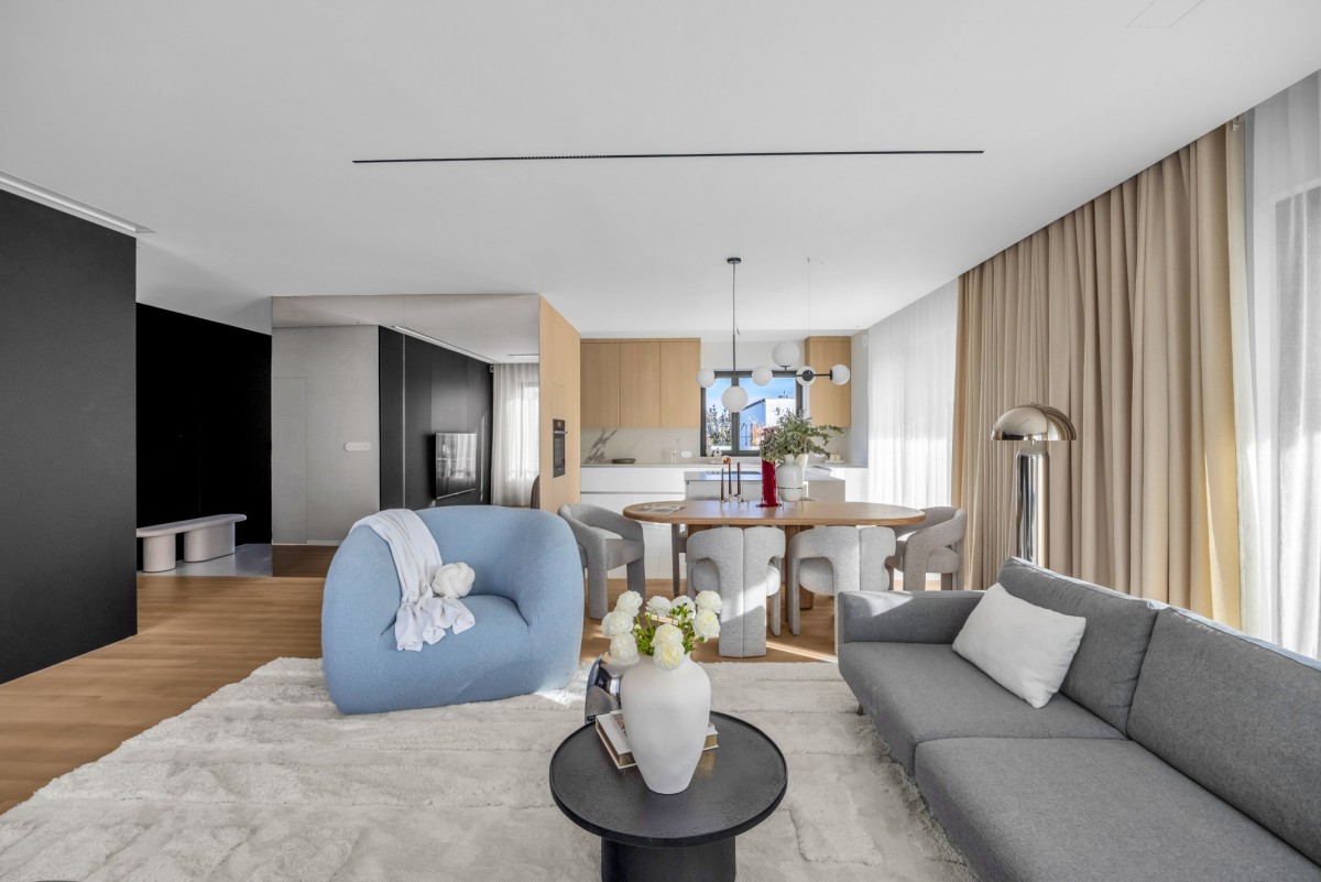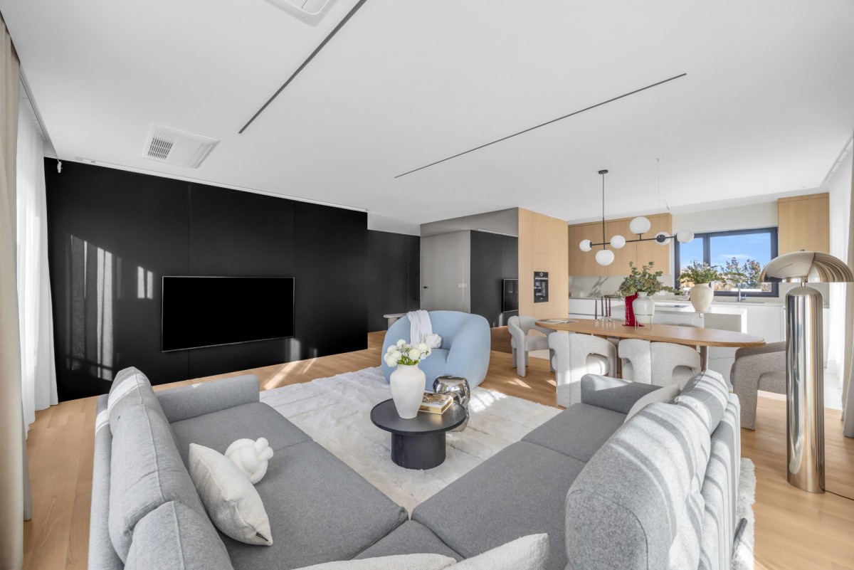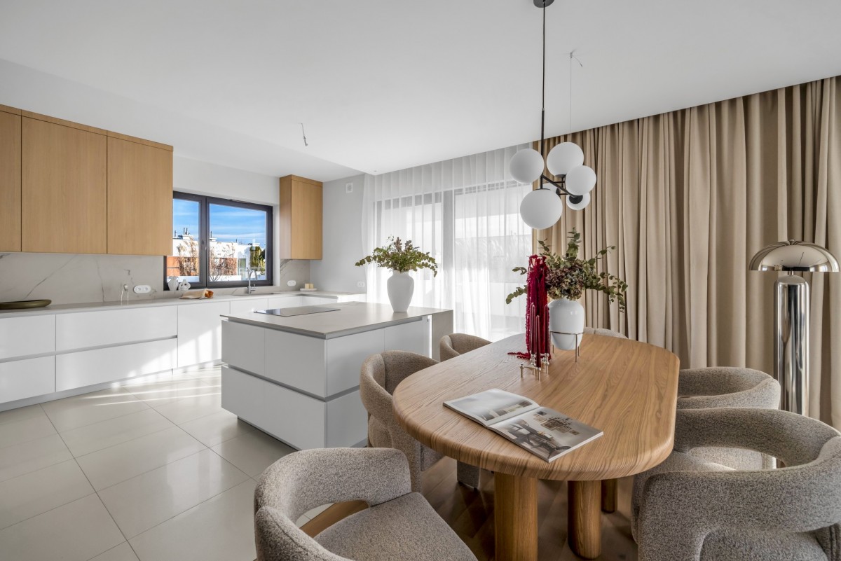 W kuchni zastosowano spieki kwarcowe, wysokiej klasy sprzęt AGD oraz zabudowę wykonaną na zamówienie. Na podłogach drewno naturalne. Apartament jest wyposażony w klimatyzację centralną.