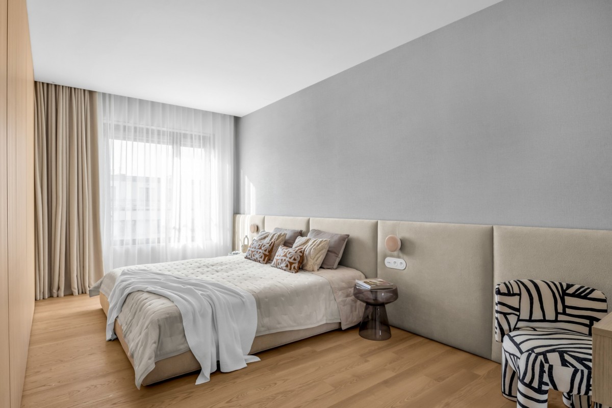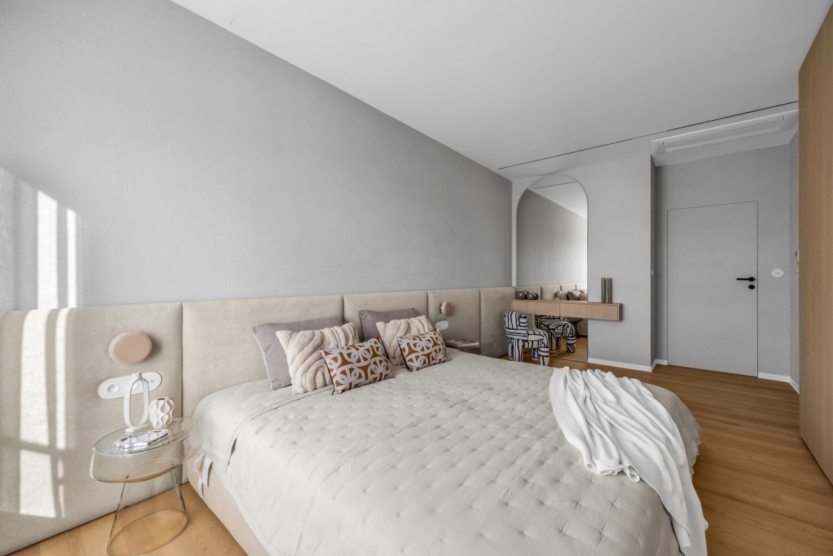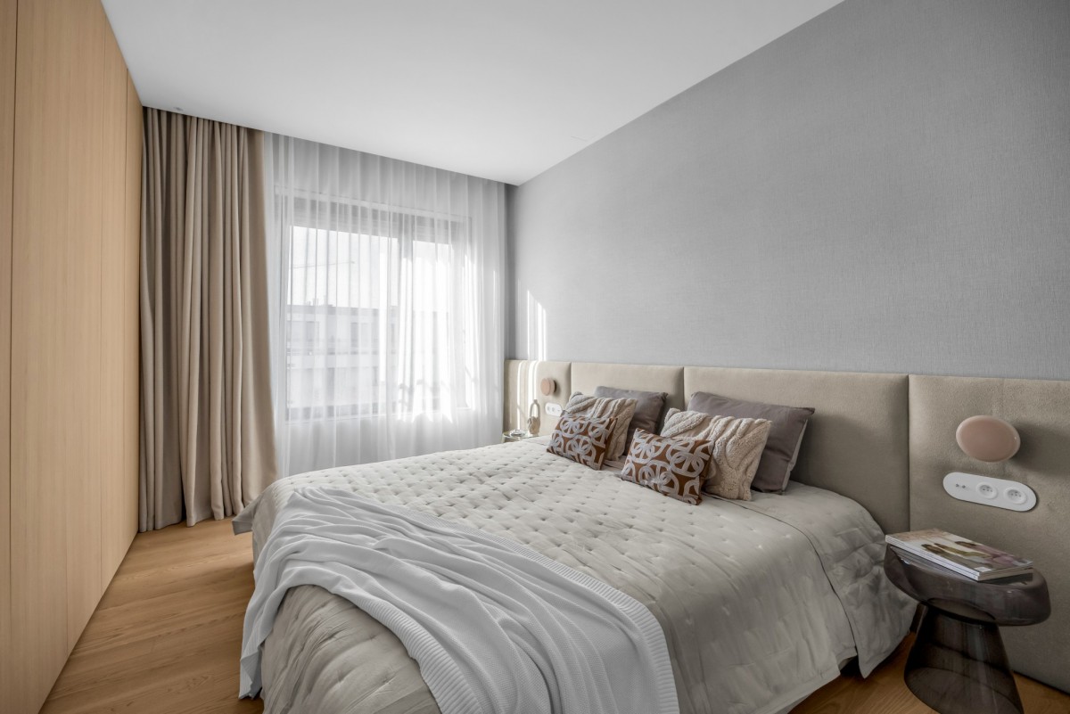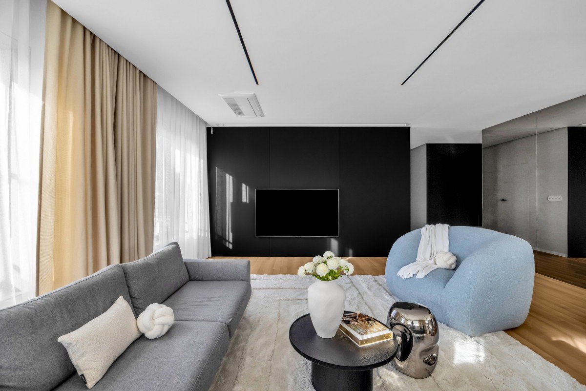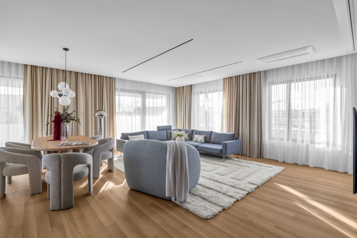 W kuchni zastosowano spieki kwarcowe, wysokiej klasy sprzęt AGD oraz zabudowę wykonaną na zamówienie. Na podłogach drewno naturalne. Apartament jest wyposażony w klimatyzację centralną.