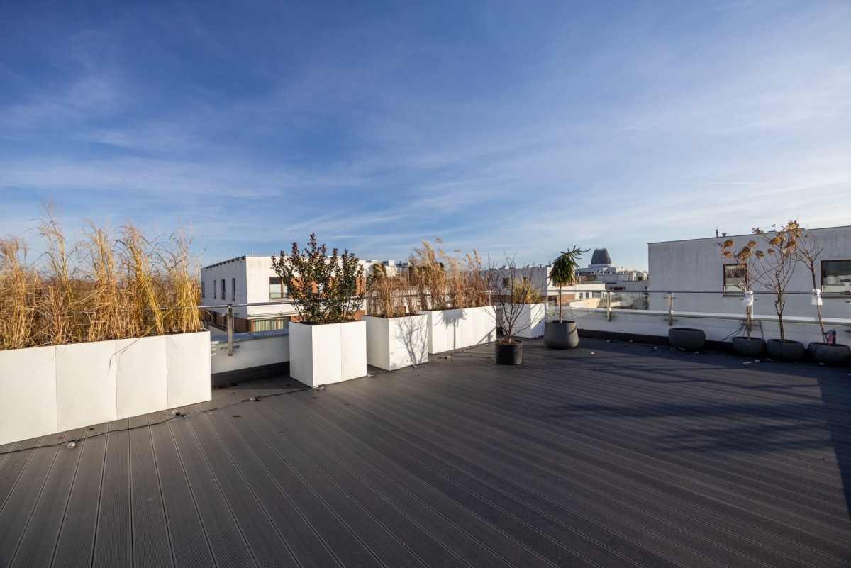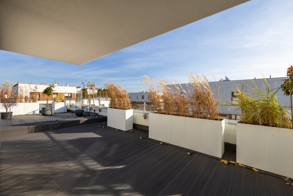 Taras otacza część dzienną, kuchnię oraz gabinet oferując wyjątkową przestrzeń do relaksu i spotkań towarzyskich, z możliwością stworzenia prywatnego ogrodu w sercu miasta.