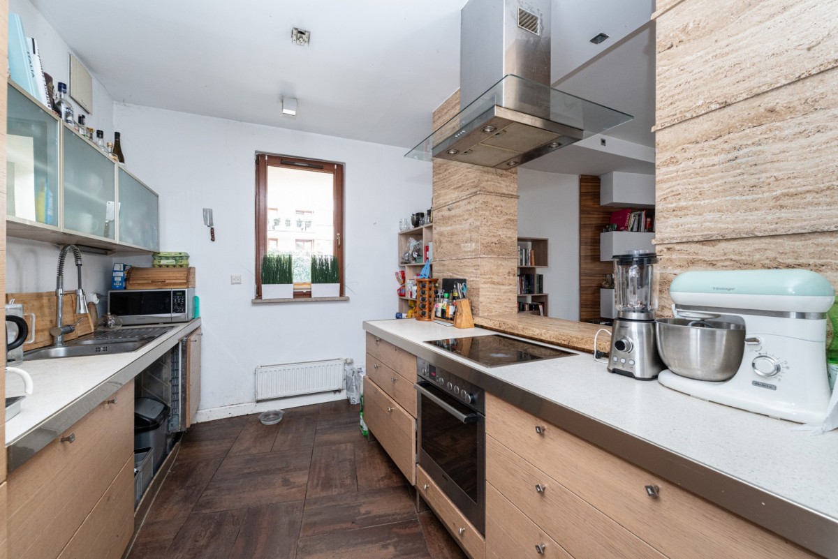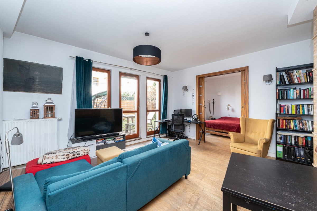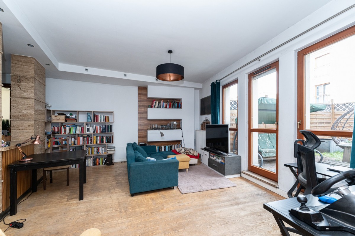 Przestronny salon (26,5m2) połączony jest z kuchnią (7,4m2) wyposażoną w meble w zabudowie kuchennej, lodówkę, zamrażarkę, kuchenkę elektryczną, okap i zlewozmywak. Z przestrzeni tej można wyjść na cichy ogród o powierzchni 49,5m2 z kompletem wypoczynkowym i mnóstwem zieleni.