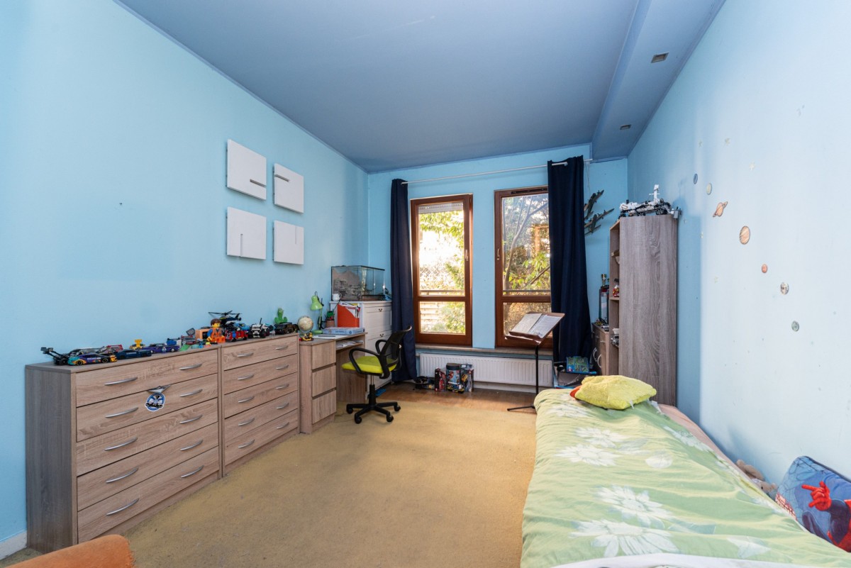 Druga sypialnia (15,8m2), pełniąca obecnie funkcję pokoju dziecięcego, jest połączona z garderobą (ok. 4,5m2) z mnóstwem miejsca do przechowywania oraz z prywatną łazienką (6,7m2) z umywalką, bidetem, wanną, WC i grzejnikiem drabinkowym.