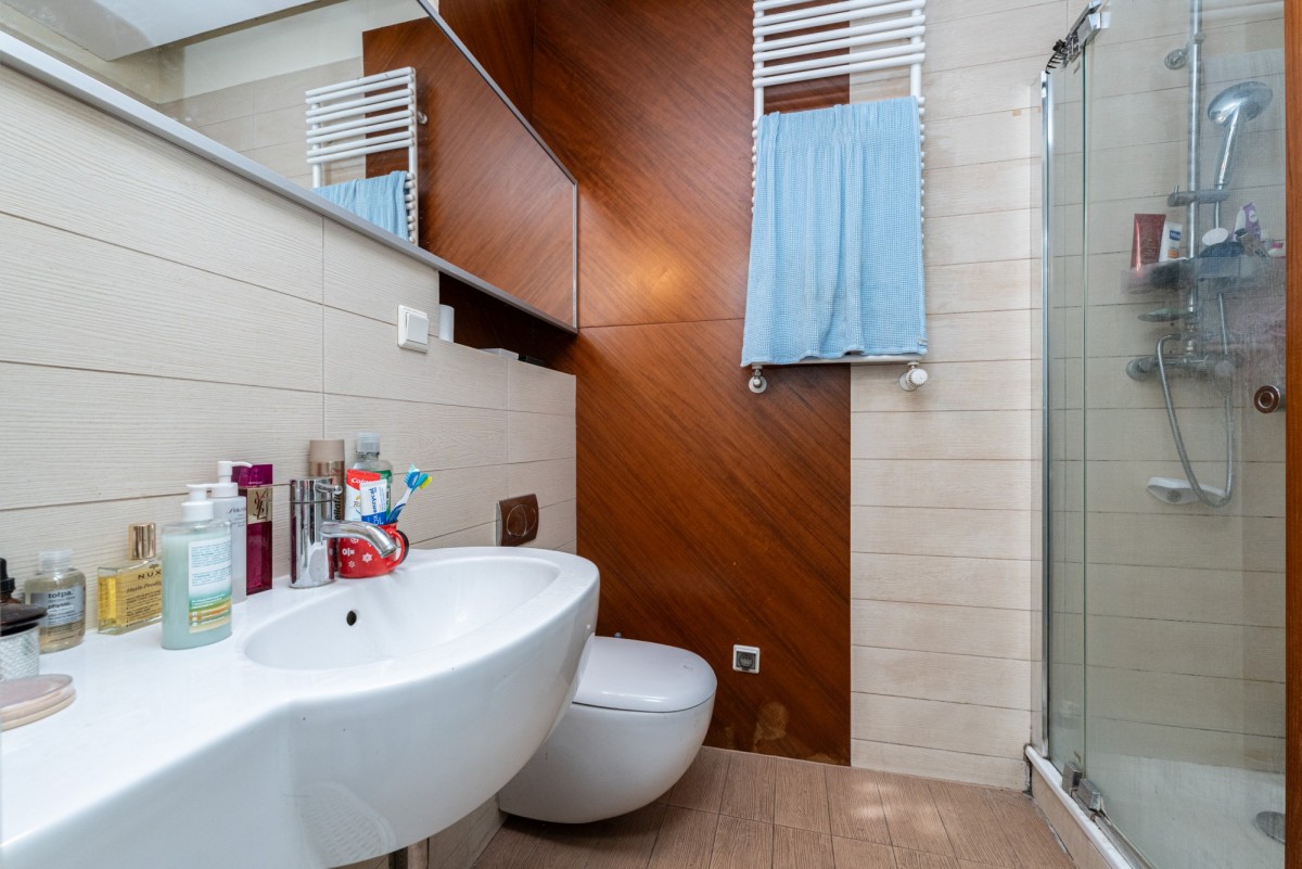Przedpokój ma 12,8m2, znajduje się w nim m.in. pojemna szafa w zabudowie, a w drugiej łazience (3,4m2) umywalka, WC, prysznic i grzejnik drabinkowy.
