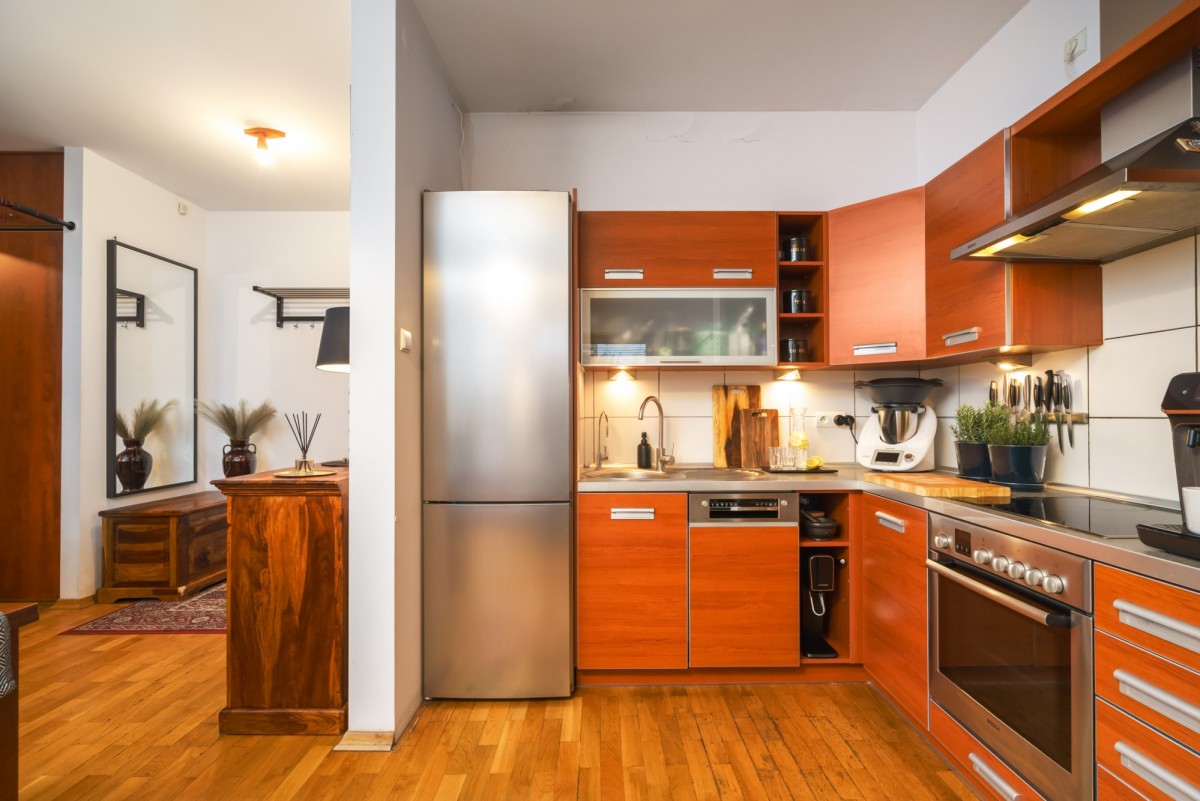 - kuchnia wyposażona w: płytę elektryczną, piekarnik, zmywarkę 45 cm, lodówkę, okap