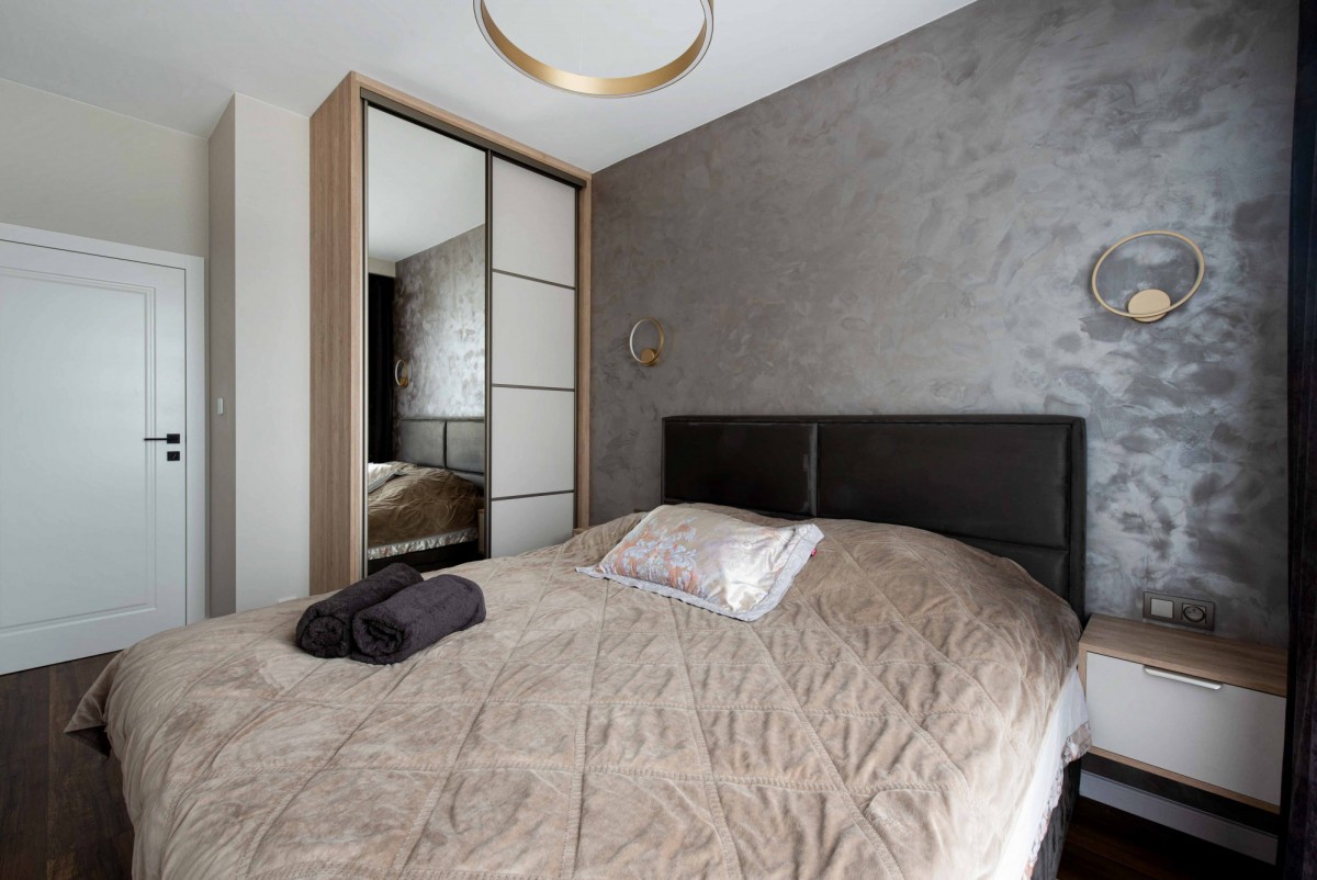 Sypialnia 12,5 m² - łóżko 180x200 z materacem ortopedycznym, szafa w zabudowie, szafki nocne