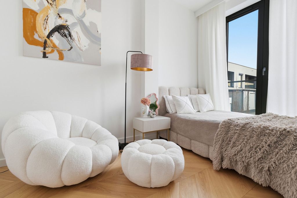 Apartament został zaprojektowany z myślą o komforcie i funkcjonalności. Jasne wnętrza, duże przeszklenia oraz bezpośrednie wyjście do ogrodu tworzą idealną przestrzeń do życia.