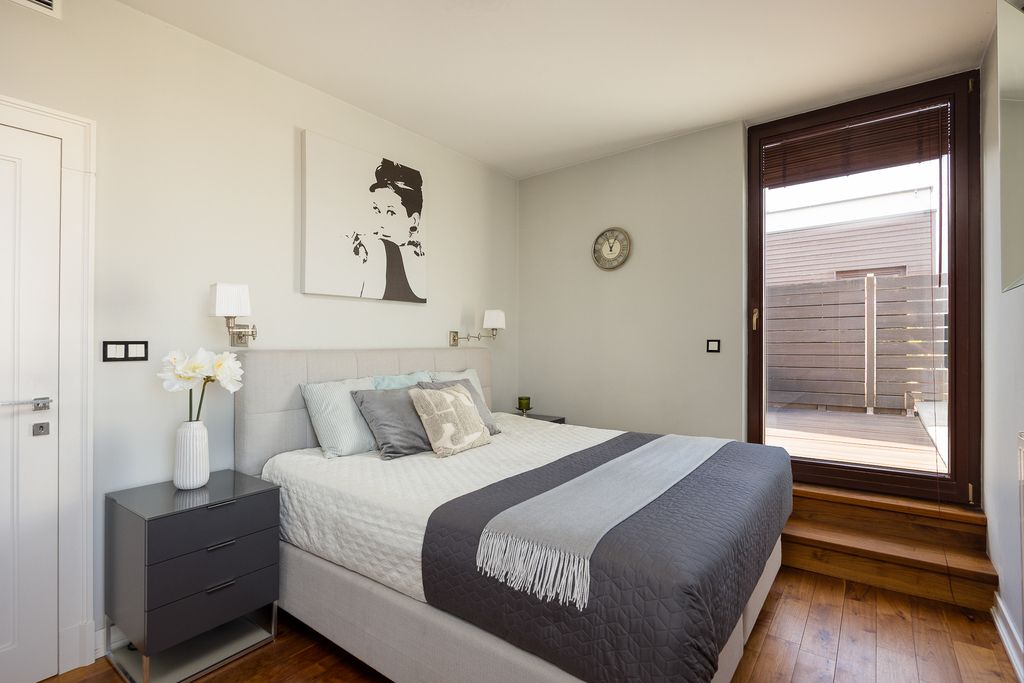 A luxurious two-bedroom apartment with a large terrace, located on the top (fourth) floor of the prestigious Scandinavian House development at 18 Rzeczypospolitej Avenue, in the heart of Miasteczko Wilanów.