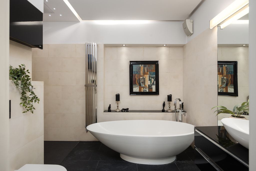 Floors feature oiled walnut wood and natural Brazilian slate, while the bathroom includes underfloor heating and a freestanding bathtub by Victoria Albert made from volcanic limestone.