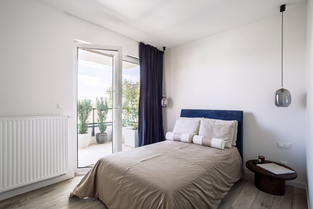 * sypialnia z szafami w zabudowie oraz wyjściem na balkon,