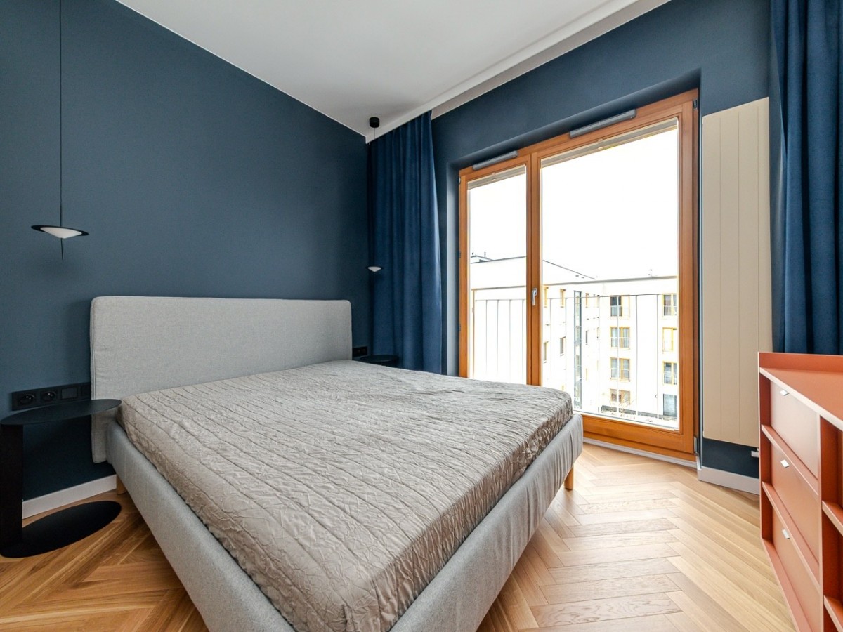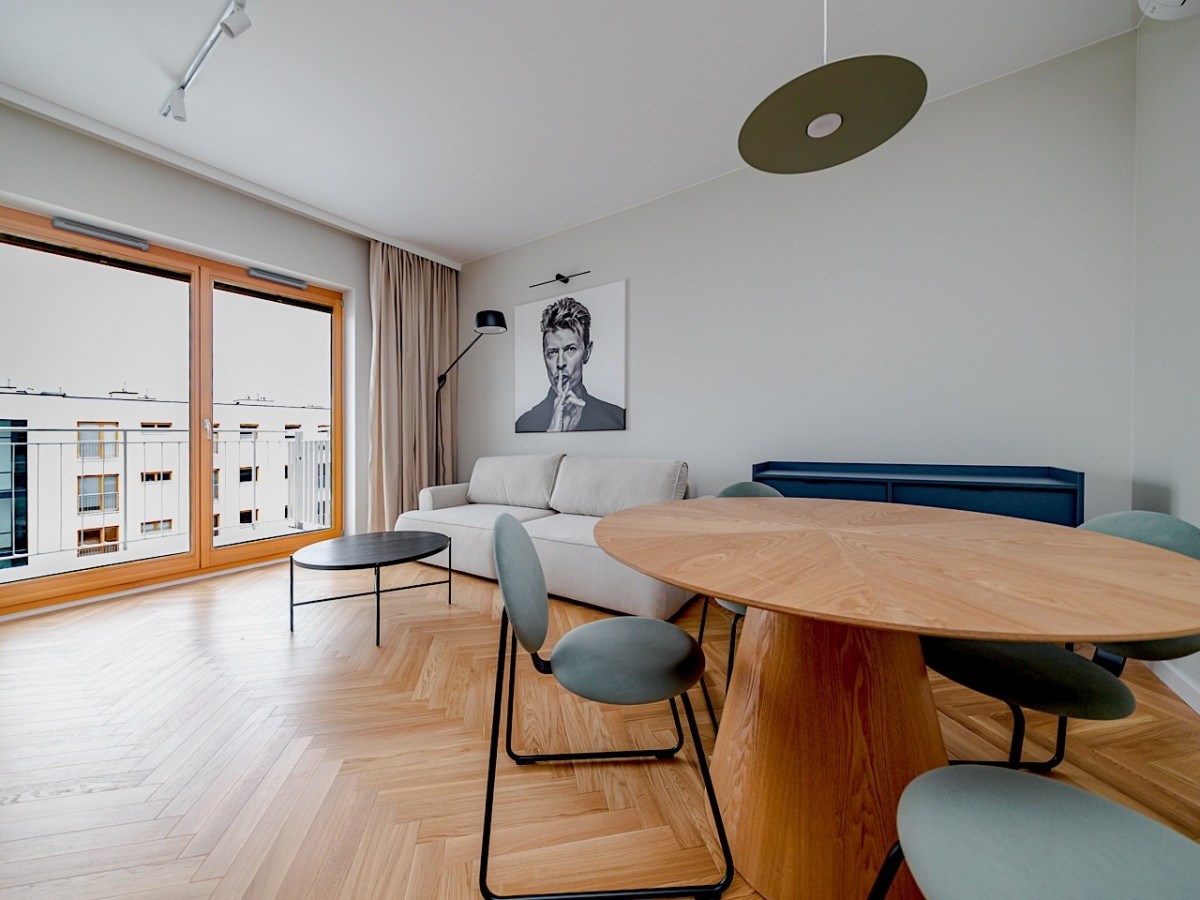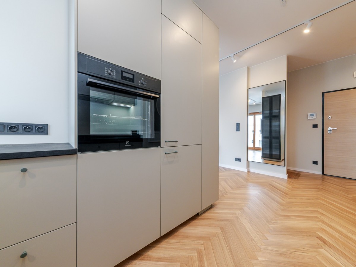 The flat is located in Błonia Wilanowskie, an attractive and developed part of Wilanów. There are shops, restaurants, service outlets and public transport stops in the immediate vicinity. Nearby, there is a so-called town square and extensive green areas, which is an additional advantage, especially for dog owners and active people.