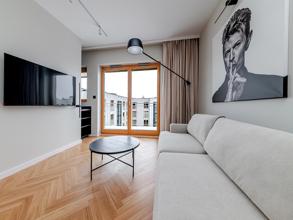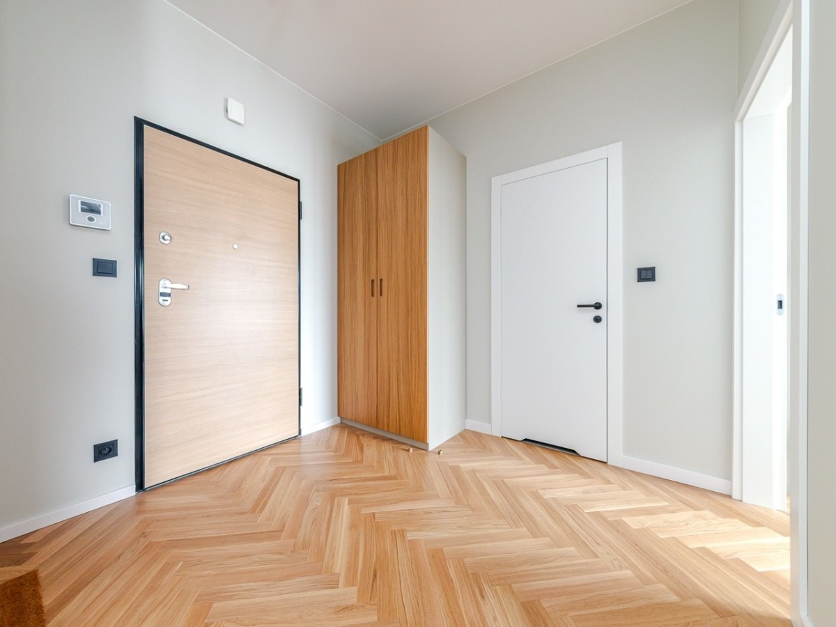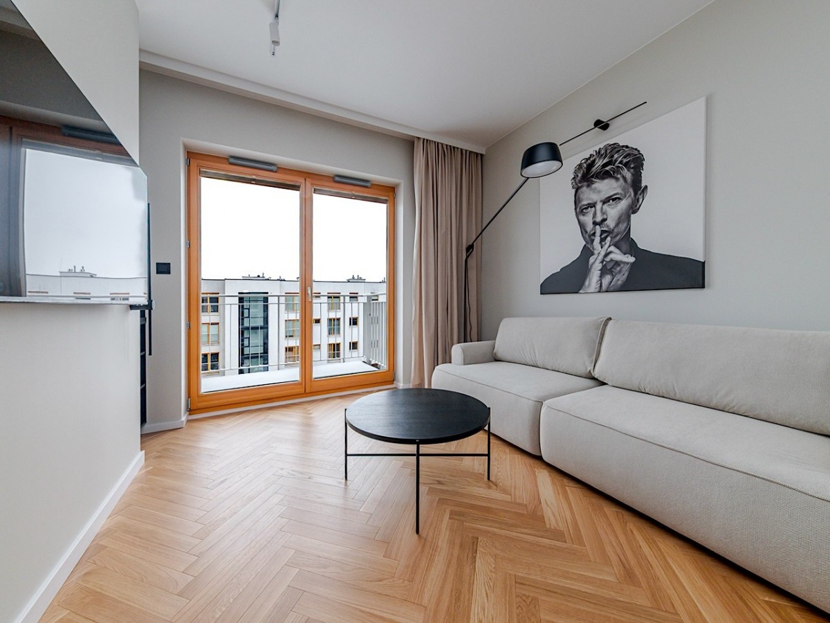 The flat is located in Błonia Wilanowskie, an attractive and developed part of Wilanów. There are shops, restaurants, service outlets and public transport stops in the immediate vicinity. Nearby, there is a so-called town square and extensive green areas, which is an additional advantage, especially for dog owners and active people.