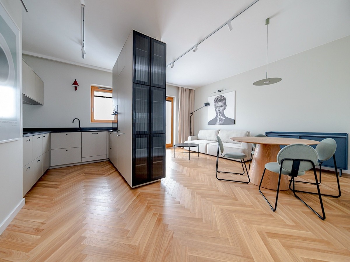 The apartment has an area of 49.7 m2. It is located on the third and top floor of an intimate building with a lift. There are only four flats on the floor, which ensures greater privacy and comfort.