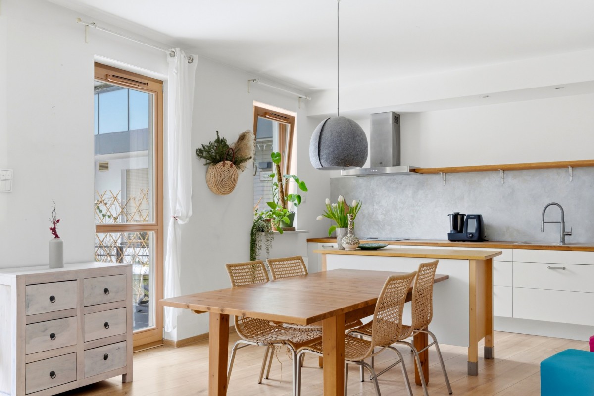 Wnętrze jest jasne i bardzo dobrze doświetlone dzięki dużym oknom oraz ponadstandardowej wysokości pomieszczeń wynoszącej 2,75 m, co dodatkowo potęguje poczucie przestrzeni.