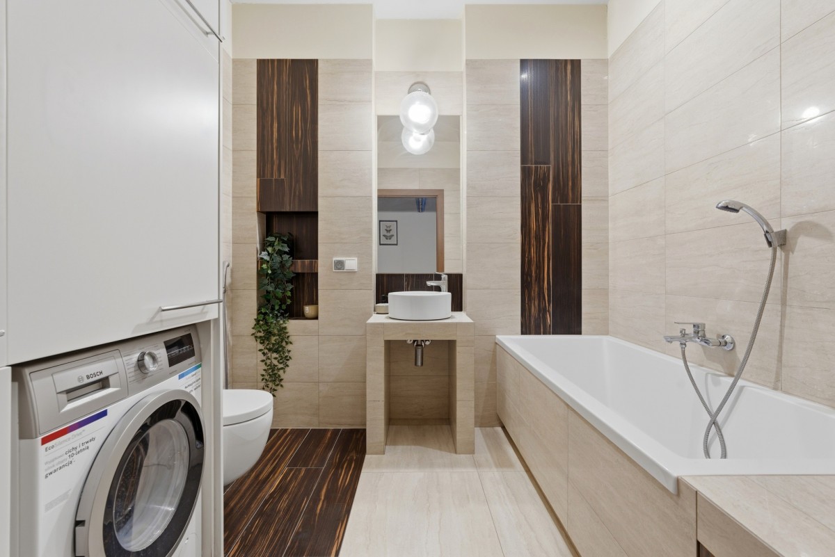 Do dyspozycji są również dwie łazienki, jedna wyposażona w wannę, druga w prysznic, co znacząco podnosi funkcjonalność mieszkania. Dodatkowym atutem są dwie garderoby, które zapewniają dużą ilość praktycznej przestrzeni do przechowywania i pomagają utrzymać porządek.