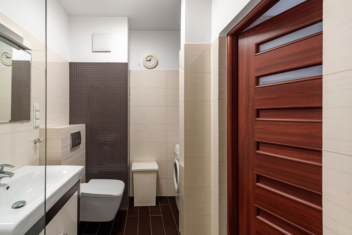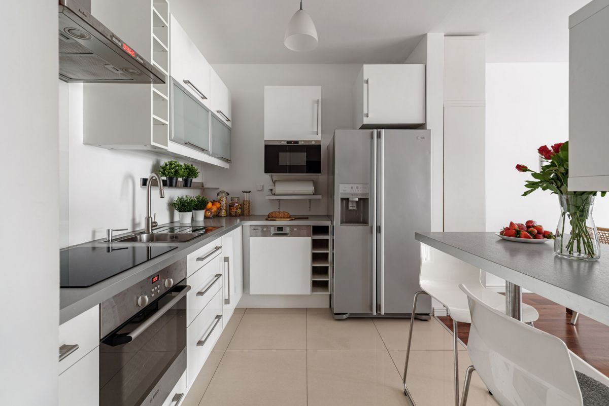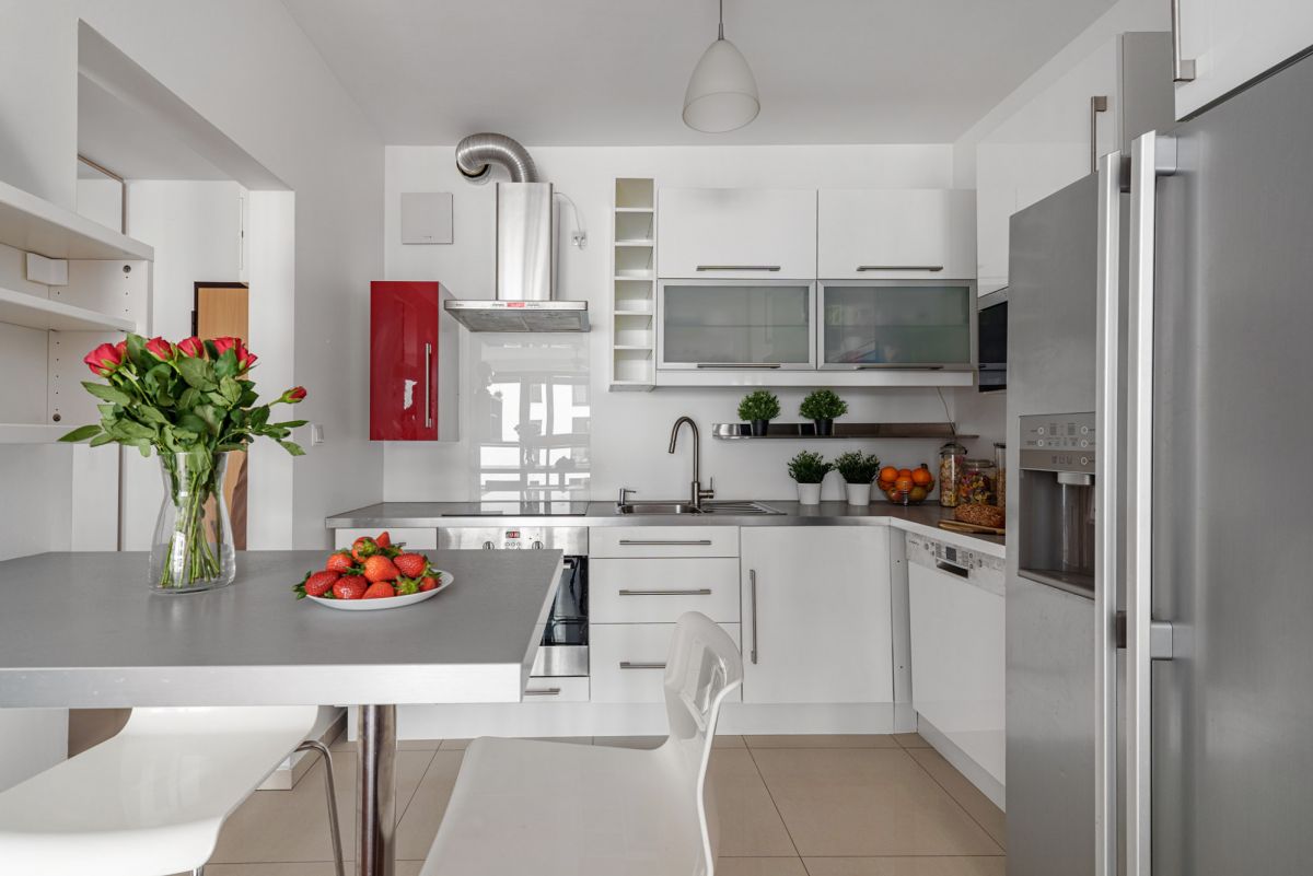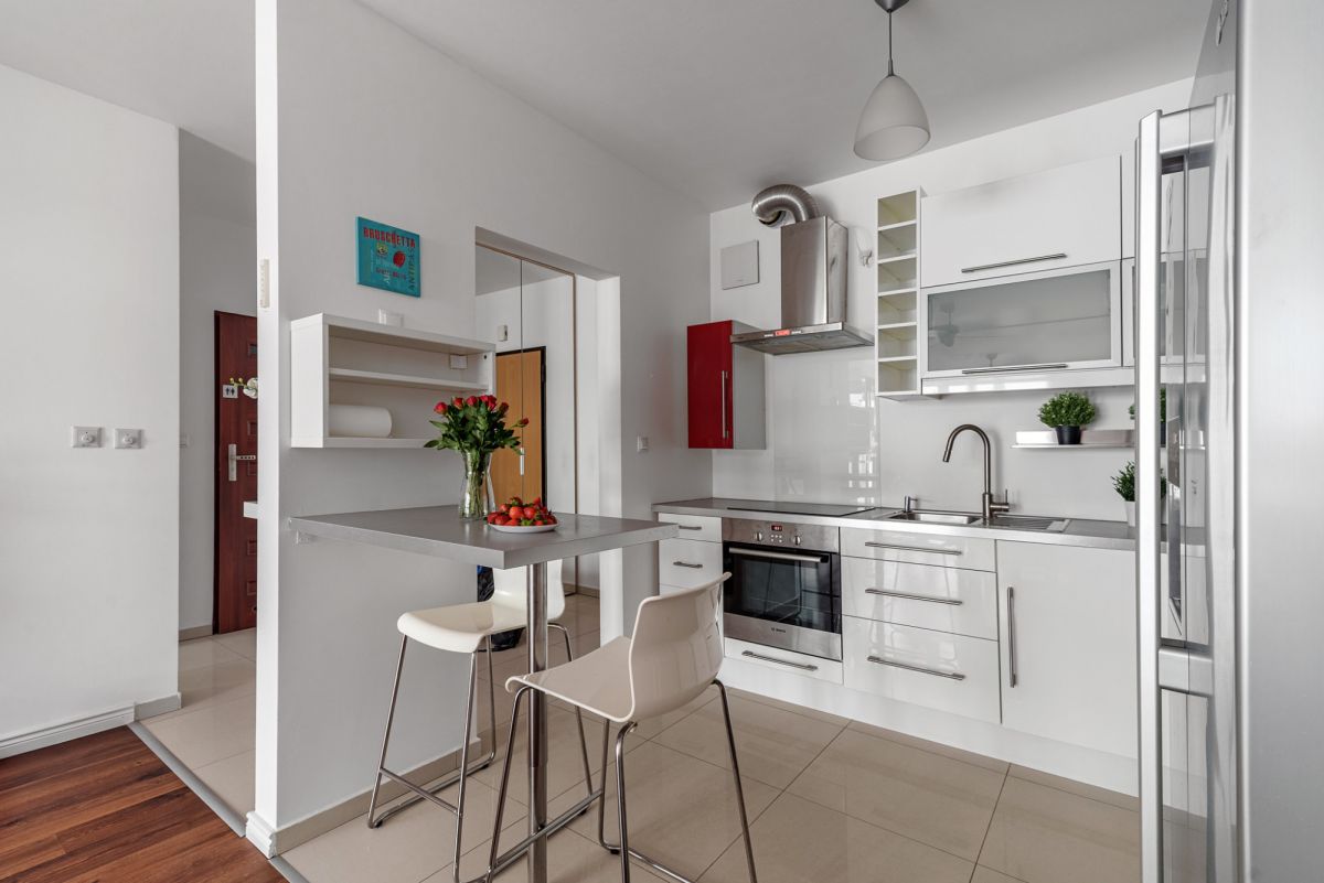 - pełne wyposażenie w sprzęt AGD: lodówka, płyta elektryczna, piekarnik, zmywarka, pralka,
