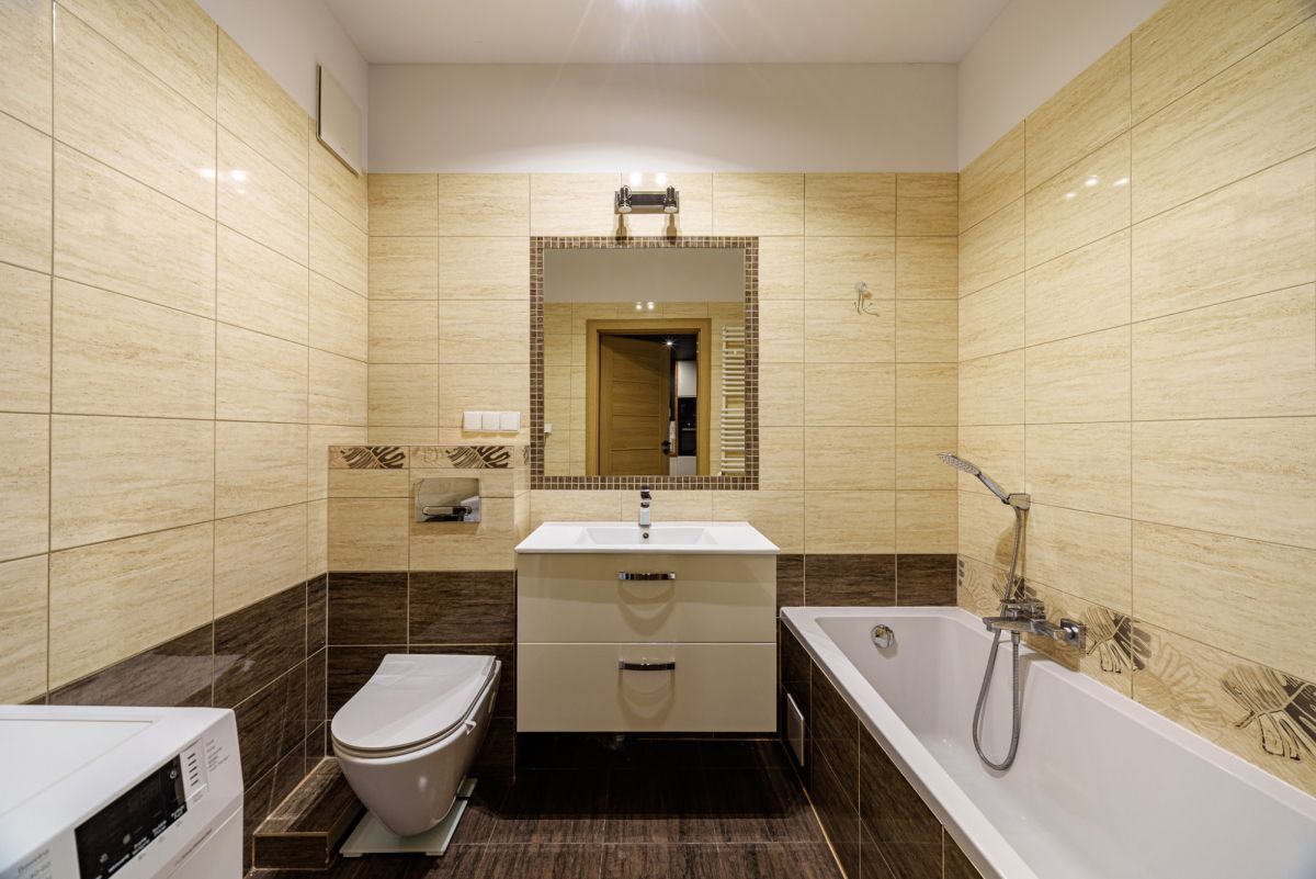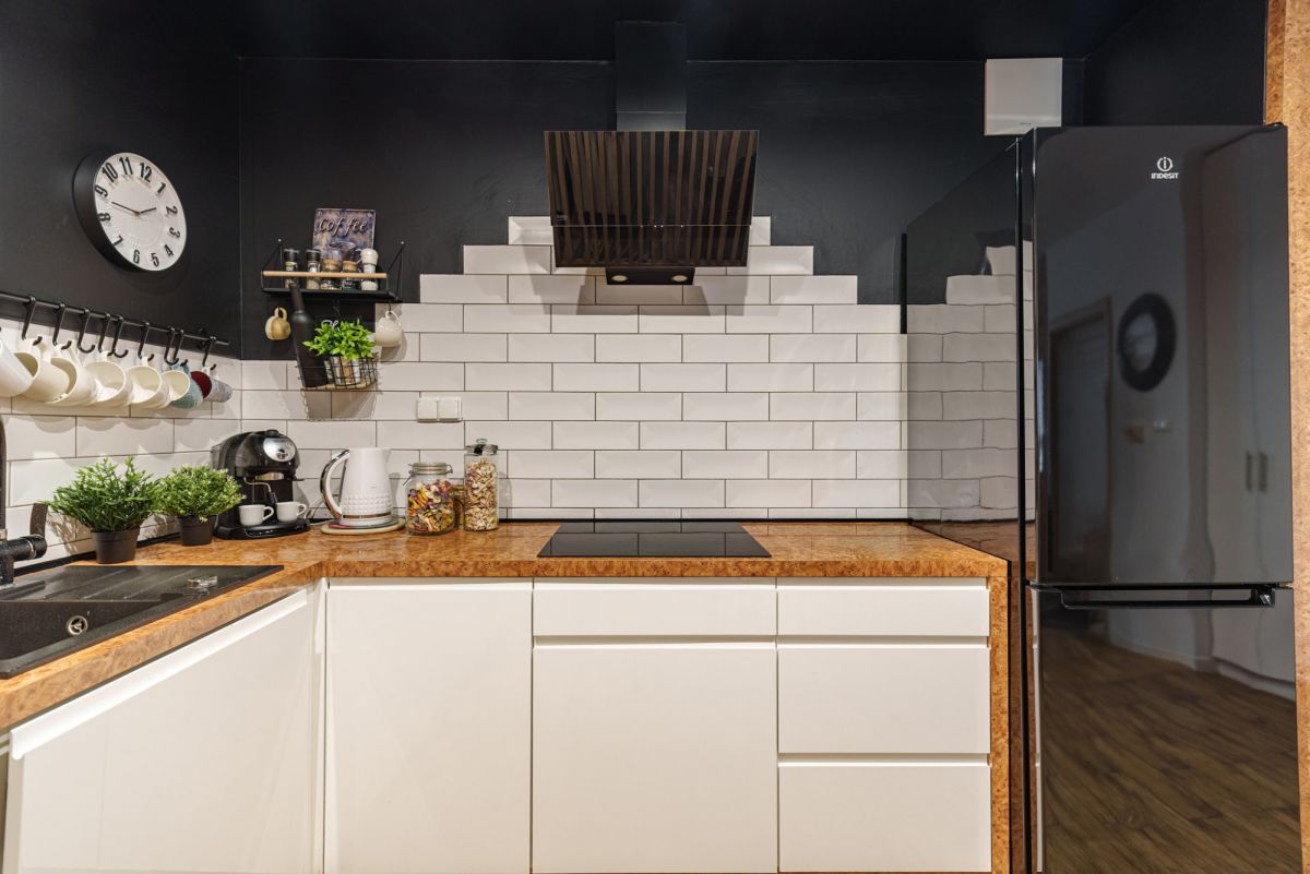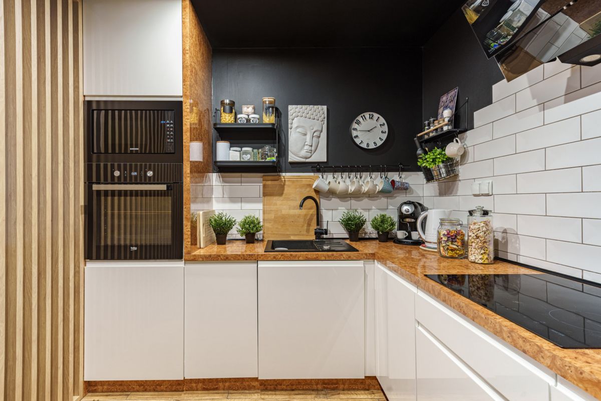 - pełne wyposażenie w sprzęt AGD: lodówka, płyta elektryczna, piekarnik, zmywarka, pralka,
