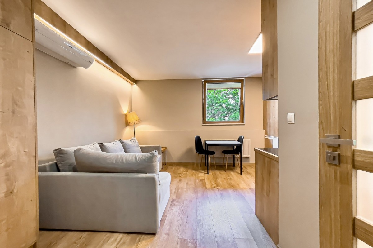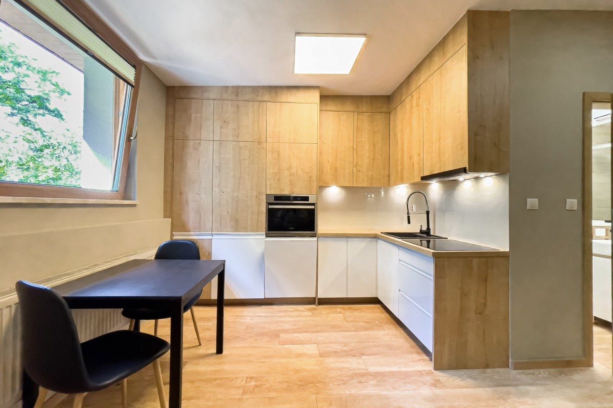 Kawalerka została zaprojektowana bardzo funkcjonalnie, aby maksymalnie wykorzystać jej potencjał. Nowoczesny aneks kuchenny, wyposażony jest w dużą lodówkę w zabudowie, płytę indukcyjną, piekarnik z funkcją mikrofali oraz dużą zmywarkę. W łazience z WC, prysznic oraz pralka. Mieszkanie jest klimatyzowane.