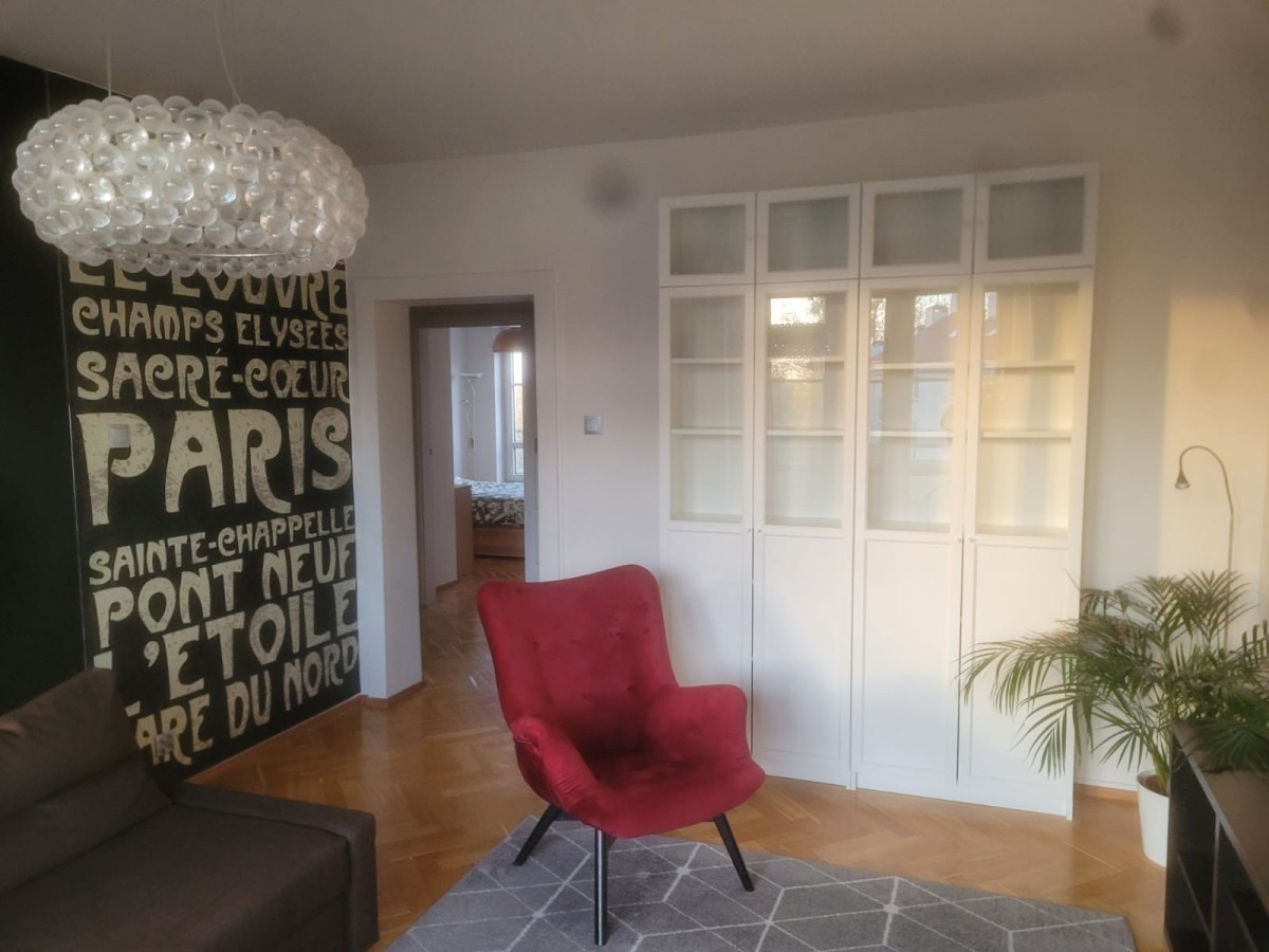 Salon z aneksem kuchennym i wyjściem na taras.Dwie sypialnie (lub sypialnia i gabinet/pokój dziecka).Łazienka (z wanną, prysznicem i najwyższej klasy ceramiką).Oddzielna, zabudowana garderoba z oświetleniem.Przestronny przedpokój.Kuchnia i Łazienka zostały wykonane na indywidualne zamówienie i zaprojektowane przez architekta. Zastosowano płytki Tubądzin z kolekcji Maciej Zień przedstawiające mapę Paryża oraz armaturę i ceramikę premium (Massi, GROHE, Omnires). W aneksie kuchennym znajduje się pełen zestaw markowego AGD oraz trwały zlewozmywak FRANKE (z 15-letnią gwarancją).