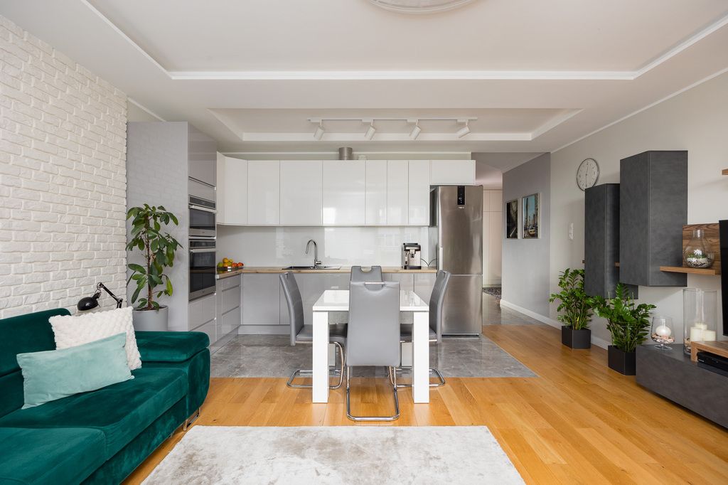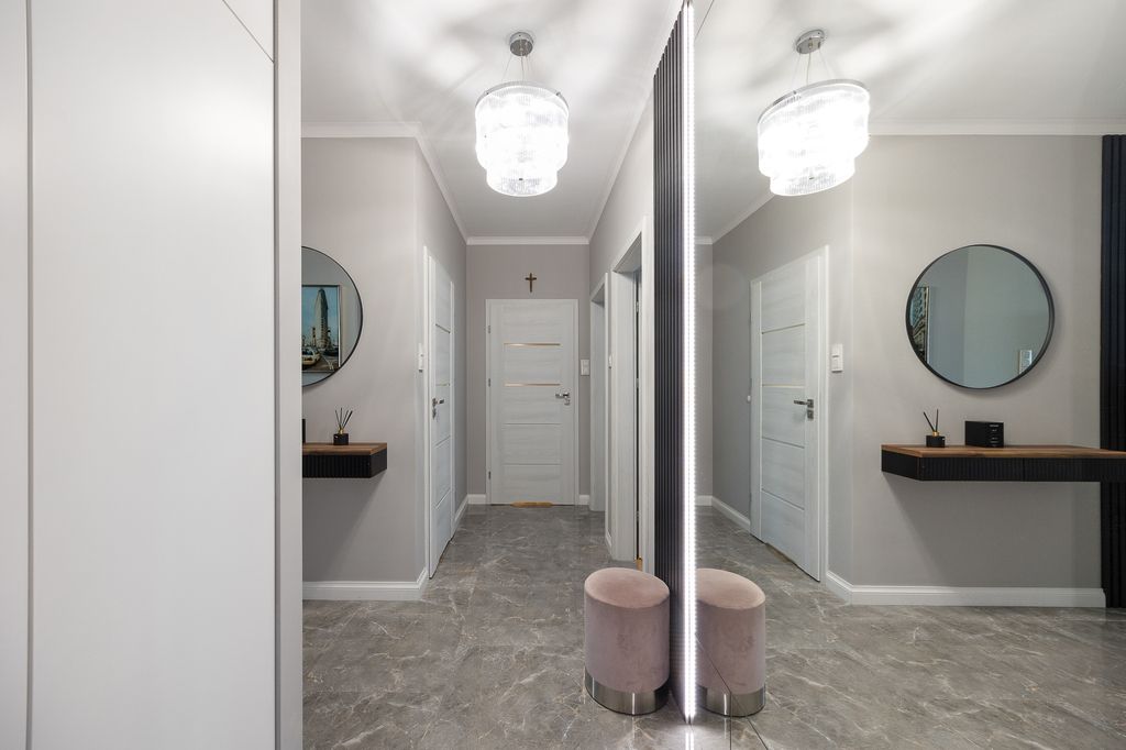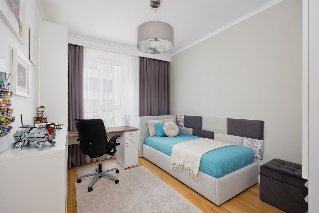 Nieruchomość w doskonałym stanie technicznym, gotowa do zamieszkania. W salonie uwagę przyciąga przeszklona niemal cała ściana, która wpuszcza do wnętrza mnóstwo naturalnego światła. W całym mieszkaniu znajdują się liczne zabudowy wykonanej na wymiar, dzięki czemu przestrzeń jest nie tylko estetyczna, ale też bardzo funkcjonalna.