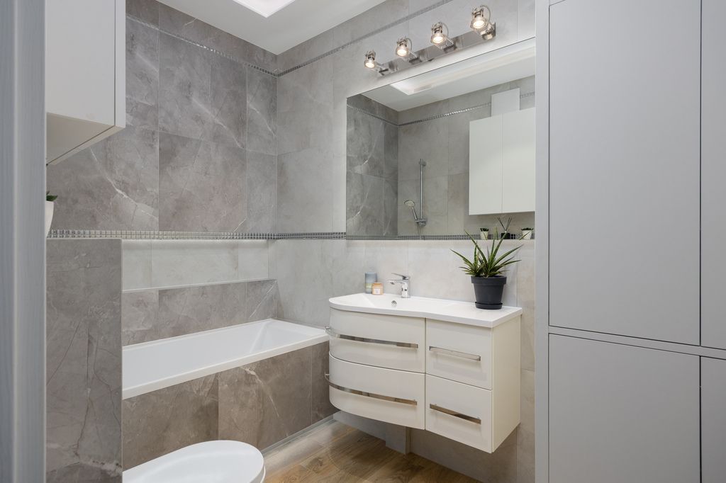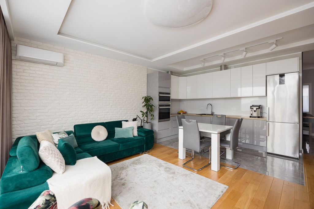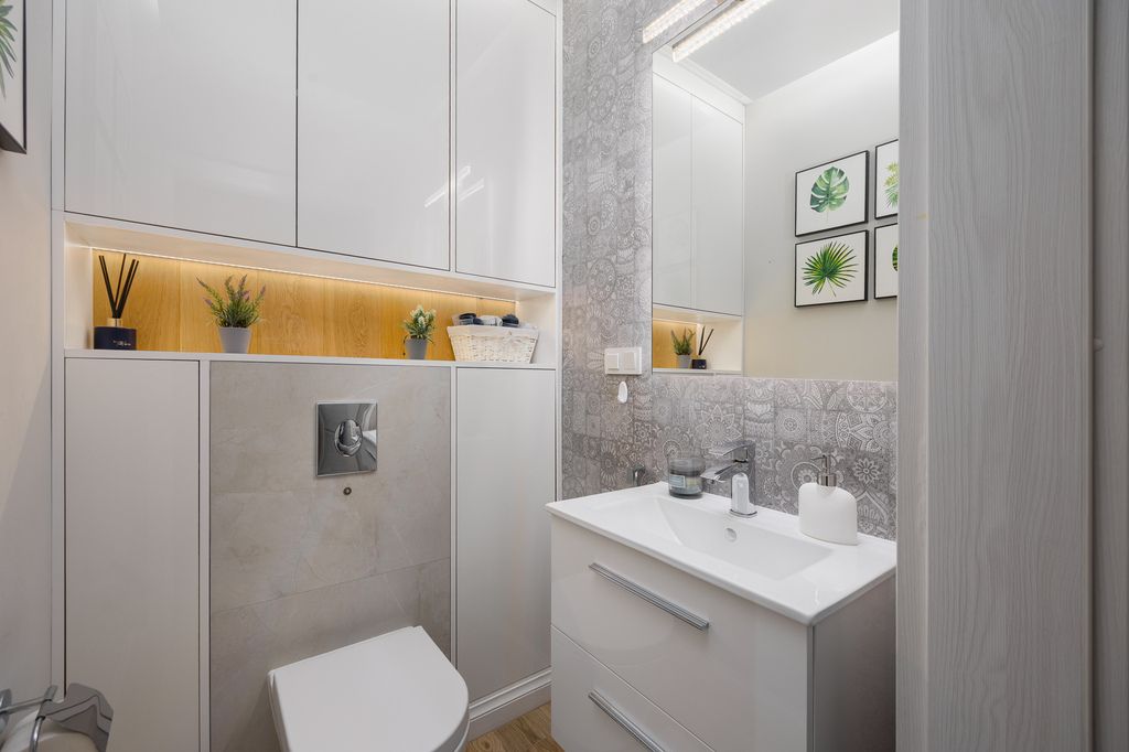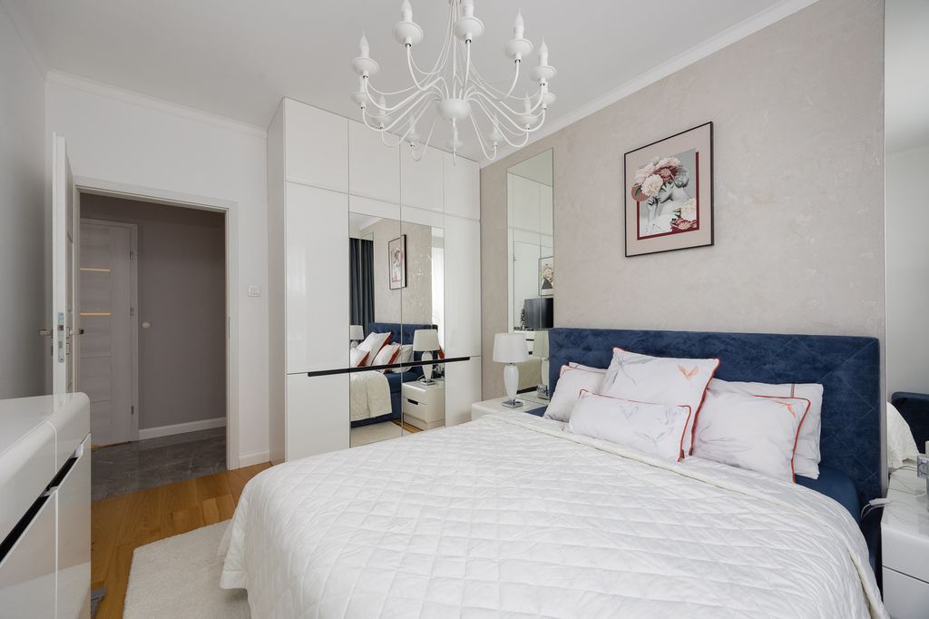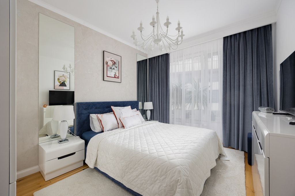 Bardzo praktyczny dwustronny układ - okna w salonie wychodzą na południe, a w sypialniach na północ. Komfort podnosi klimatyzacja oraz nowoczesne oświetlenie LED. Kuchnia została w pełni wyposażona w sprzęty AGD: piekarnik, mikrofalówkę, zmywarkę, płytę indukcyjną w zabudowie oraz wolnostojącą lodówkę. W łazience znajduje się praktyczna zabudowa meblowa z miejscem na pralkę i suszarkę.