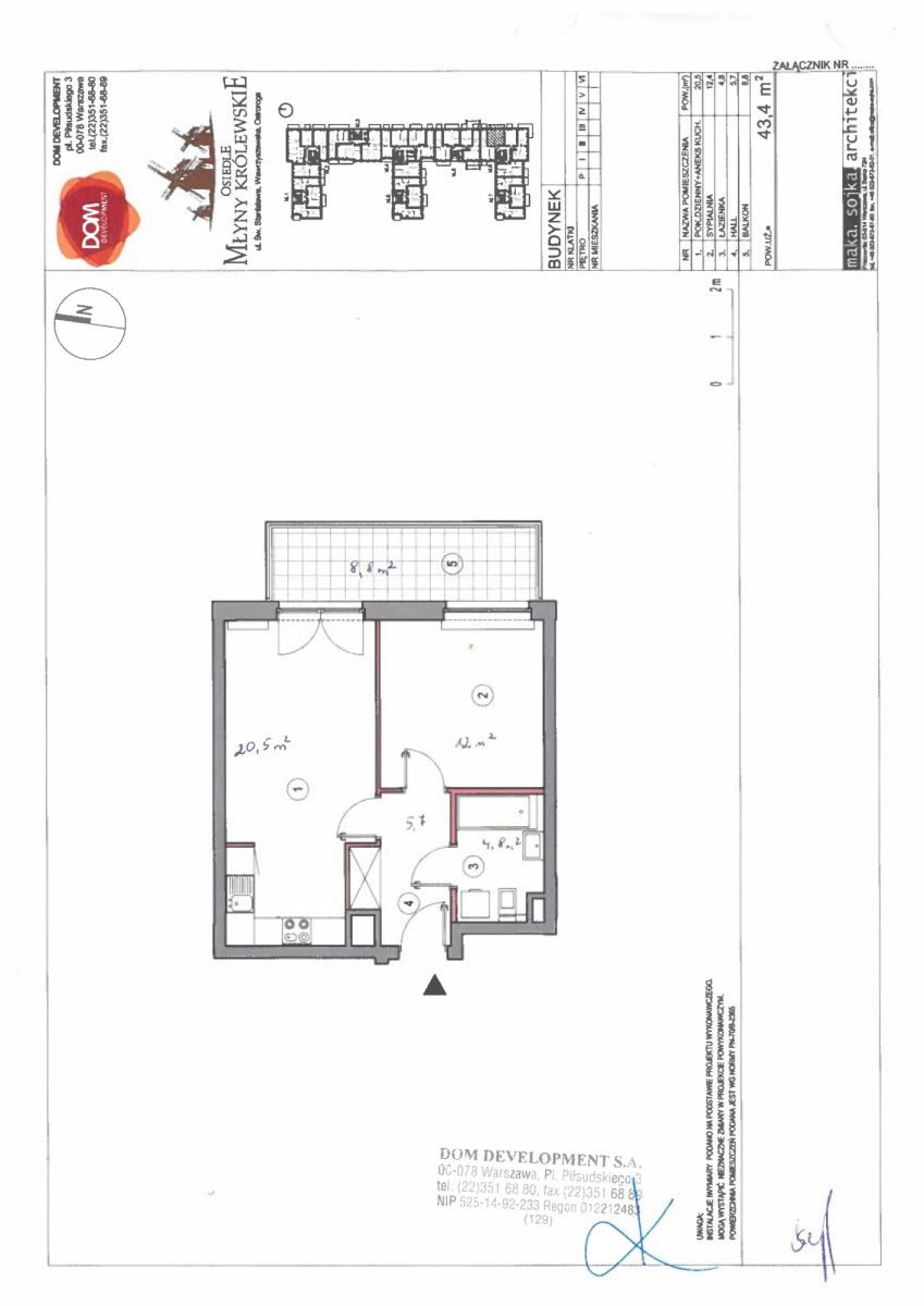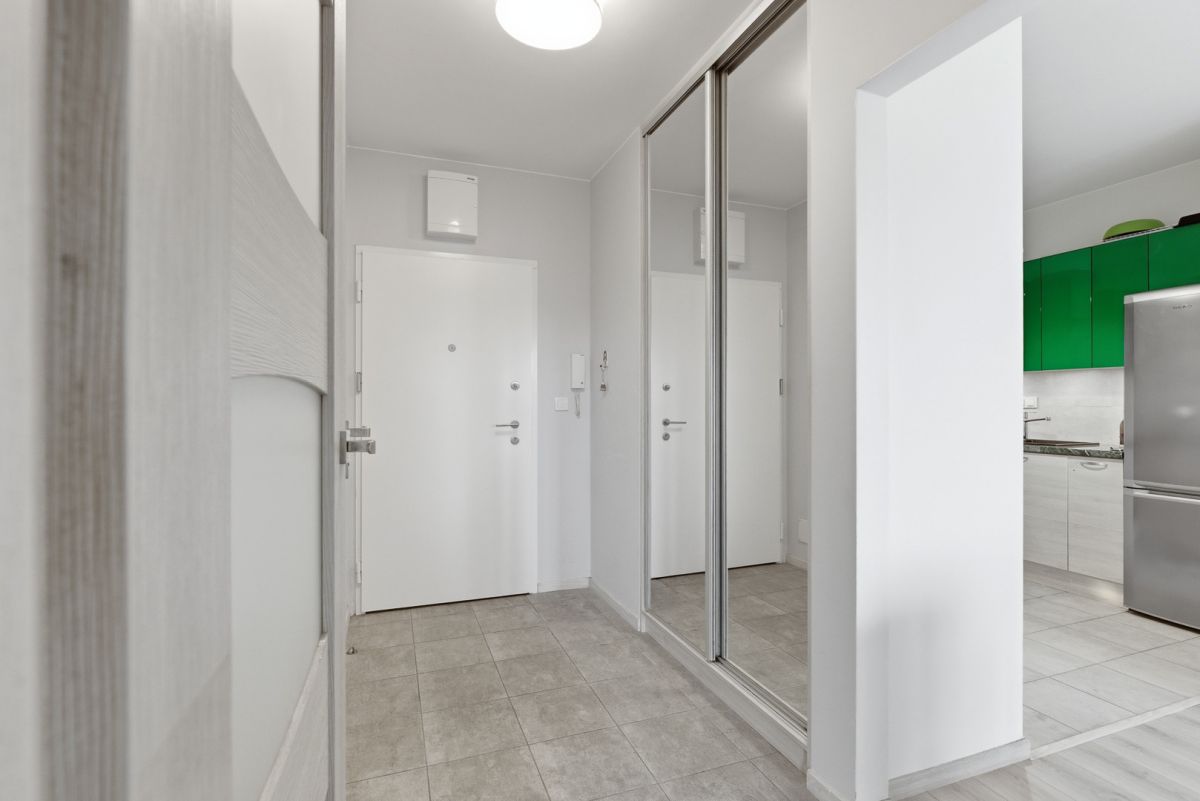 Mieszkanie o powierzchni 43,5 m2 znajduje się na 4 piętrze zadbanego budynku z windą i garażem podziemnym. Ekspozycja wschodnia.
