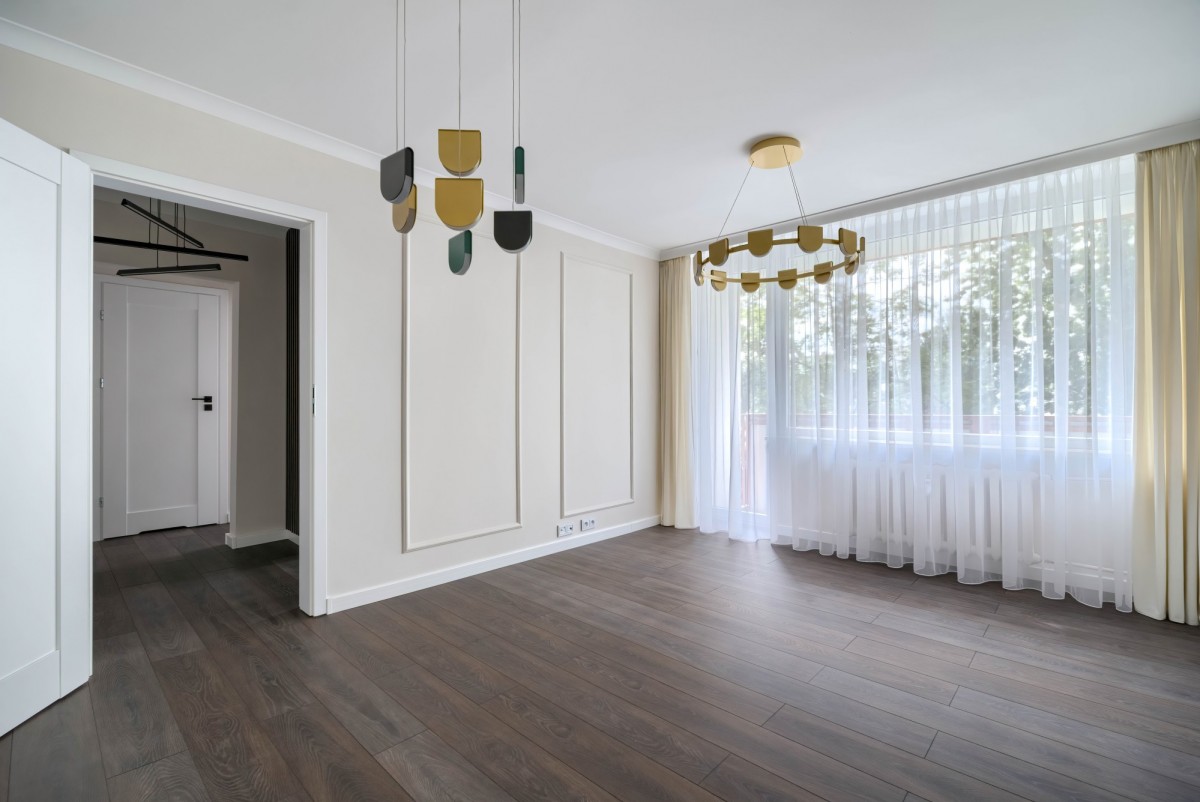 salonu z dużym oknem wychodzącym na zieleń oraz wyjściem na balkon,