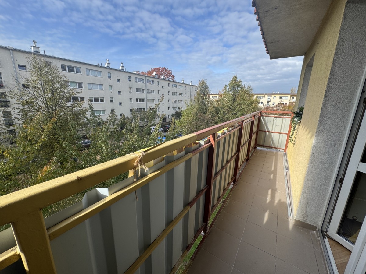 Atutem mieszkania jest duży balkon wychodzący na zieleń i zaciszny skwerek. Nikt nie zagląda w okna.