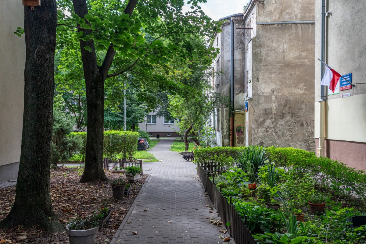Budynek, w którym znajduje się mieszkanie, to zadbana kamienica z odnowioną elewacją i czystą, schludną klatką schodową. Na parterze funkcjonuje biblioteka publiczna, a spokojne otoczenie zapewnia komfort codziennego życia.