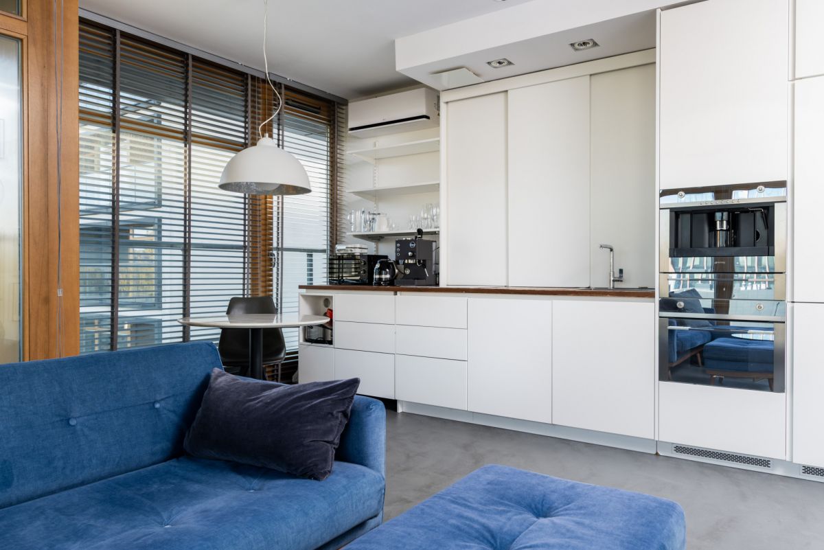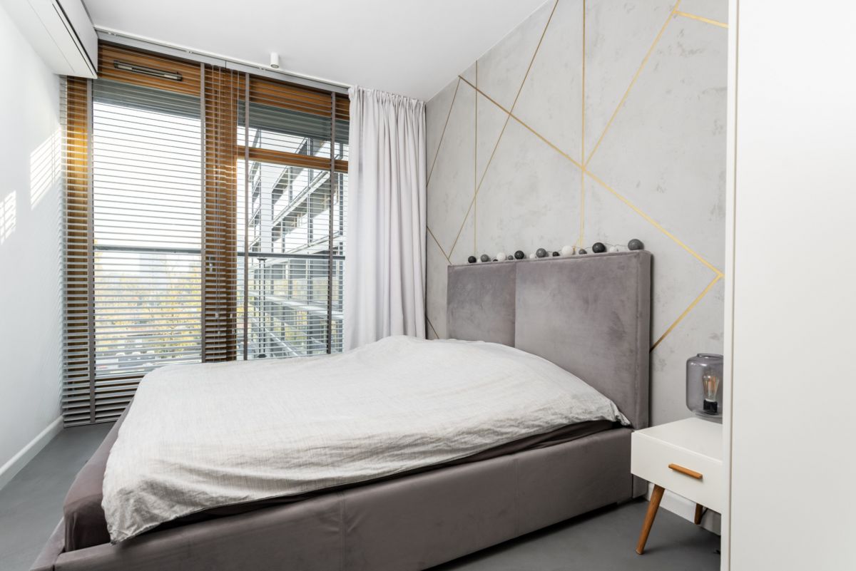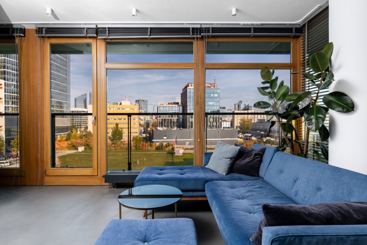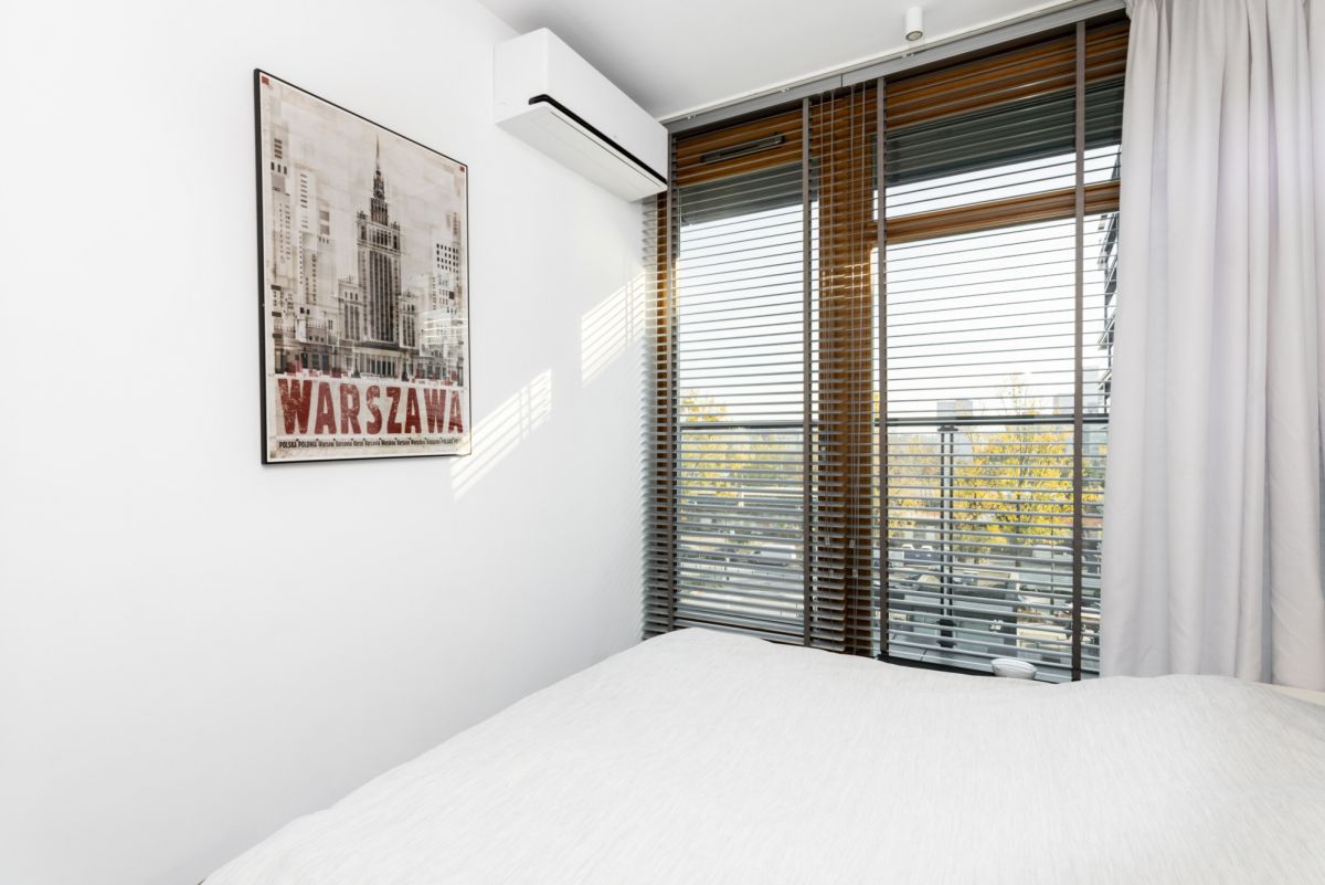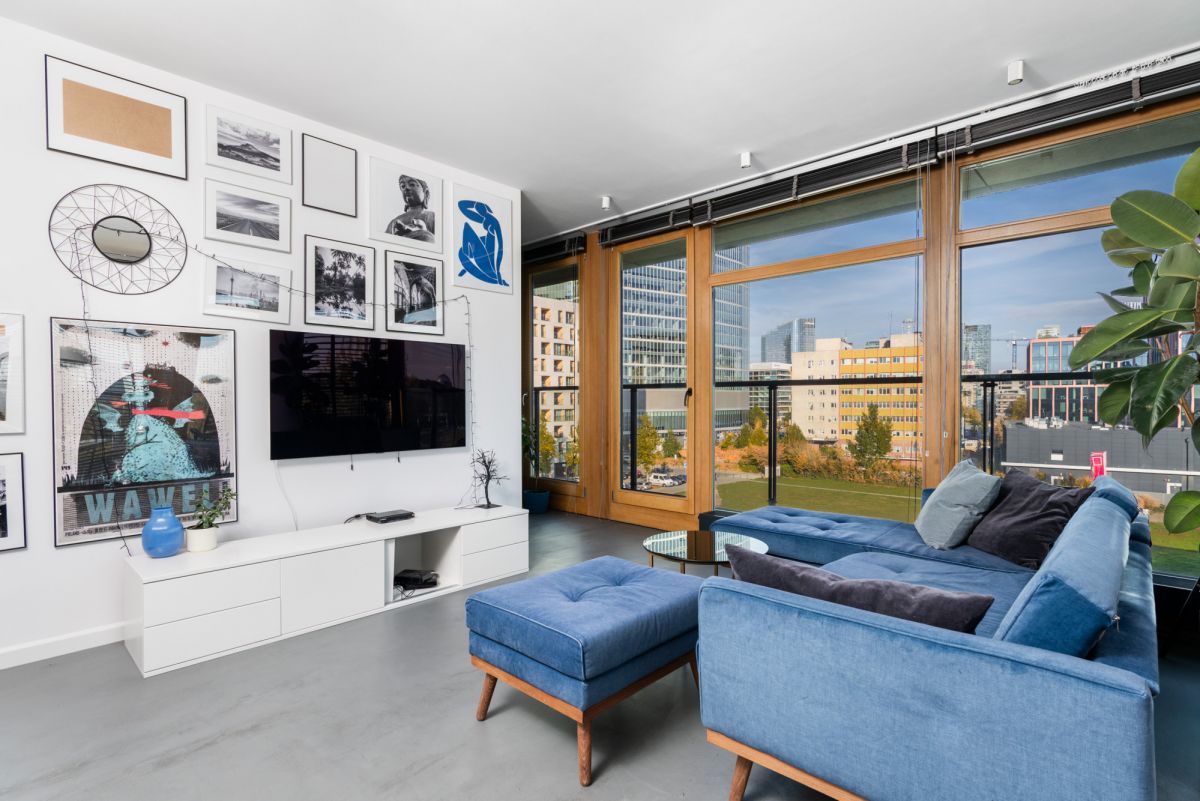 Przestronne wnętrza wypełnia naturalne światło dzięki dużym oknom, które nadają mieszkaniu wyjątkowego charakteru. Salon połączony z kuchnią tworzy elegancką i otwartą przestrzeń dzienną, idealną zarówno do relaksu, jak i przyjmowania gości. Z salonu wyjście na balkon, z którego roztacza się panoramiczny widok na Warszawę, pozwala cieszyć się świeżym powietrzem i spokojem w samym sercu miasta.