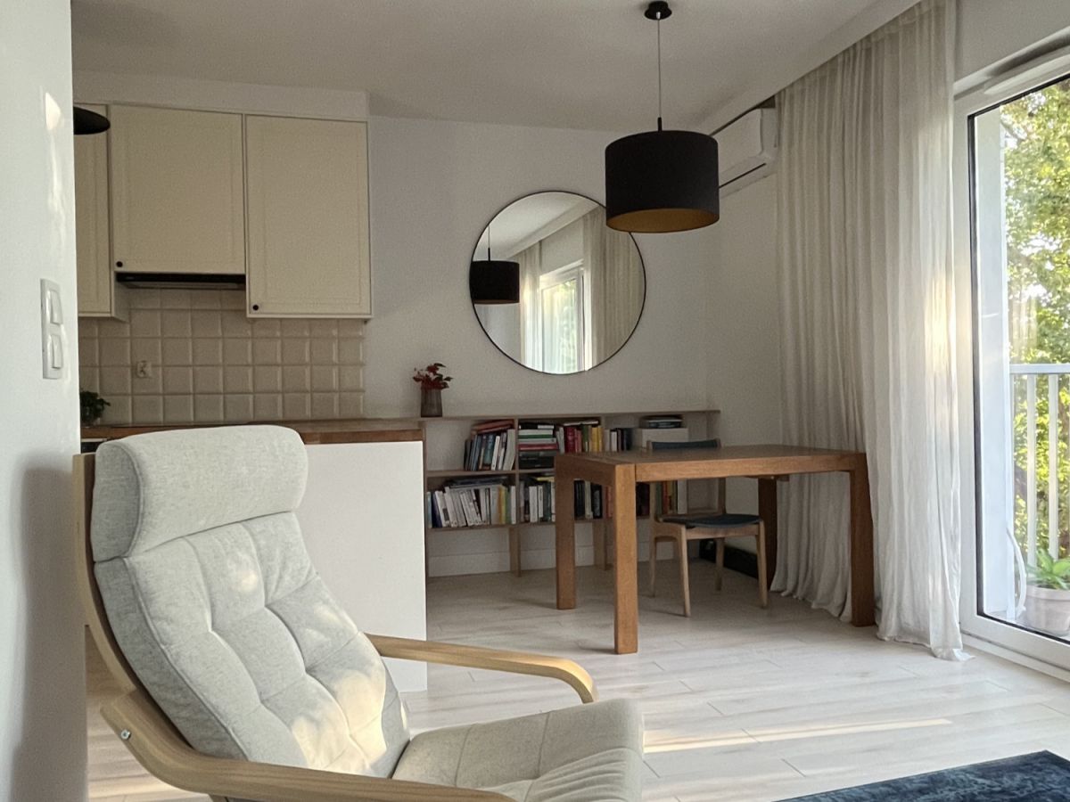 Mieszkanie jest dobrze doświetlone - duże okno w salonie wychodzi na zachód, a dwa pokoje skierowane na północ. Zainstalowana jest klimatyzacja.