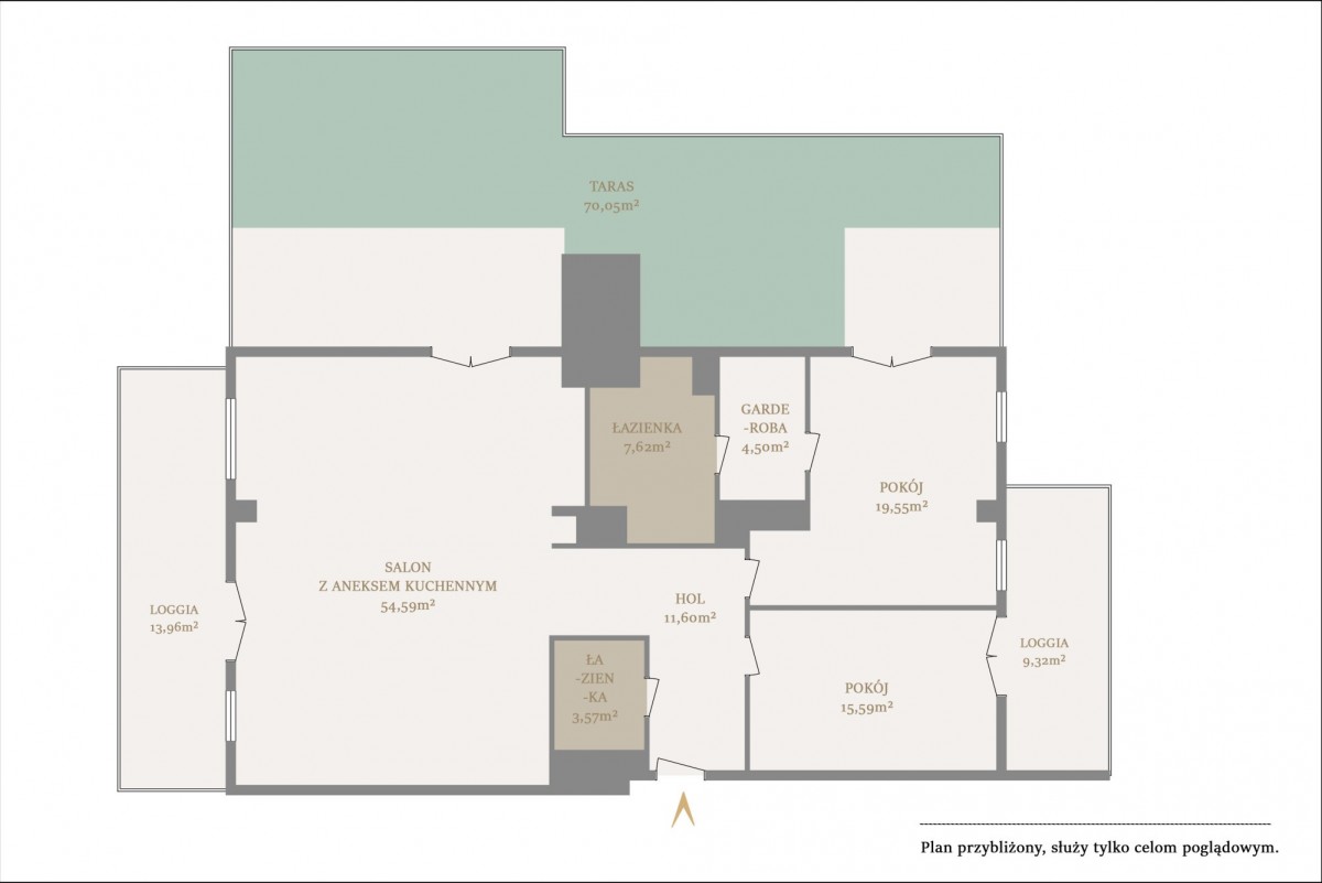 • Prywatny taras o powierzchni 70 m² z częścią zieloną i strefą relaksu
