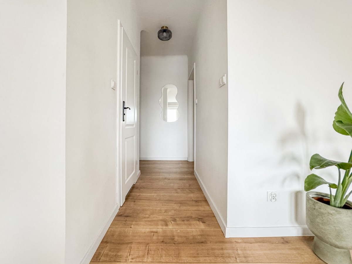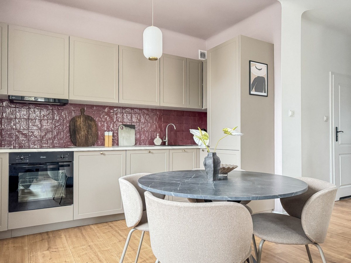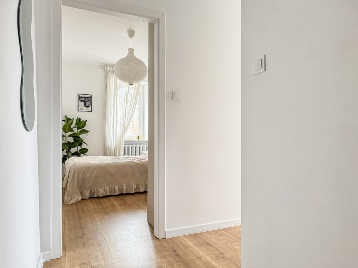 Na pierwszym piętrze czeka świeżo odnowione mieszkanie - dwa pokoje, kuchnia połączona z salonem, okna wychodzące na południowy zachód, dzięki czemu popołudniowe światło wpada do środka miękko i ciepło, jakby celowo trochę dłużej zostawało na kawę przy stole.